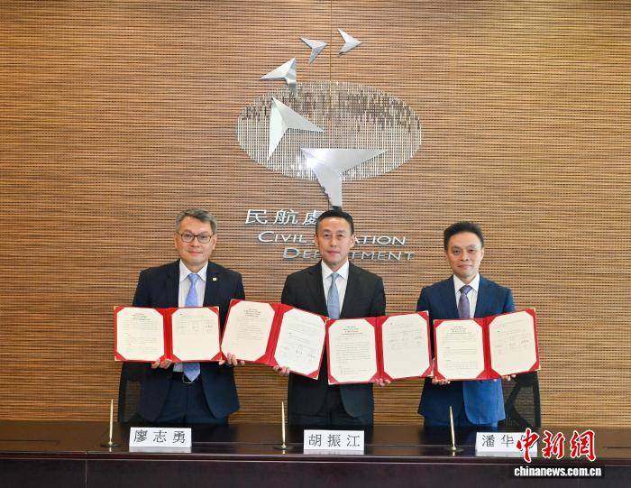 4月30日,中国民用航空局副局长胡振江(中)、香港特区政府民航处处长廖志勇(左)和澳门特区政府民航局局长潘华健(右)在香港签署四项合作安排。(香港特区政府新闻处 供图)
