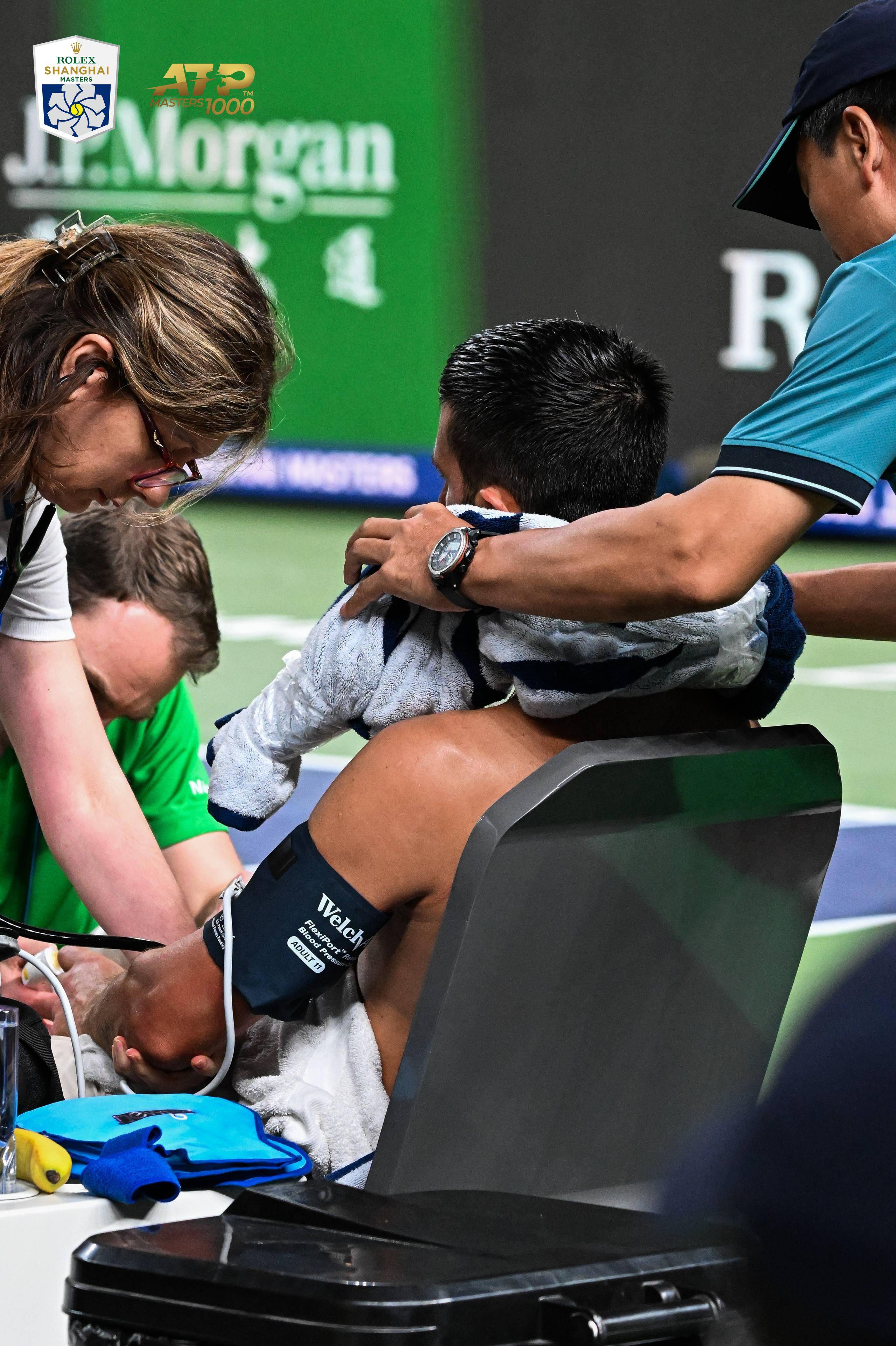除了腿伤,德约科维奇的体能也出现问题。第二盘结束,德约科维奇因消耗过大摊倒在地。医疗团队上前询问的同时,还为其测量了血压确保安全。