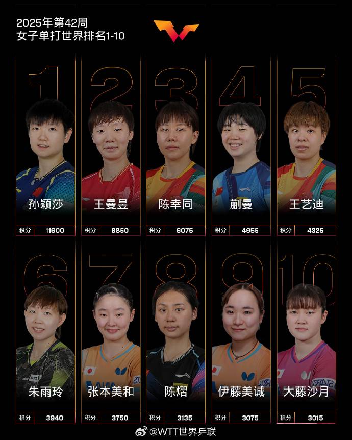 10月14日,国际乒联公布2025年第42周世界排名,核心主力孙颖莎、王楚钦、王曼昱等稳居前列,年轻选手陈熠稳步进阶。