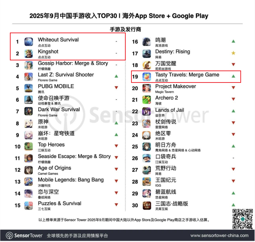 10月11日,Sensor Tower最新发布的9月中国手游出海收入榜显示,世纪华通专注海外市场的子公司Century Games旗下《Whiteout Survival》与《Kingshot》连续第三个月包揽冠亚军席位,另外《Tasty Travels: Merge Game》排名也提升4位至第19名。与此同时,在全球知名游戏媒体Pocket Gamer近日公布的《2025年全球TOP50移动游戏商》榜单中,Century Games从去年第7位跃居全球第一,创下该榜单晋升速度纪录。