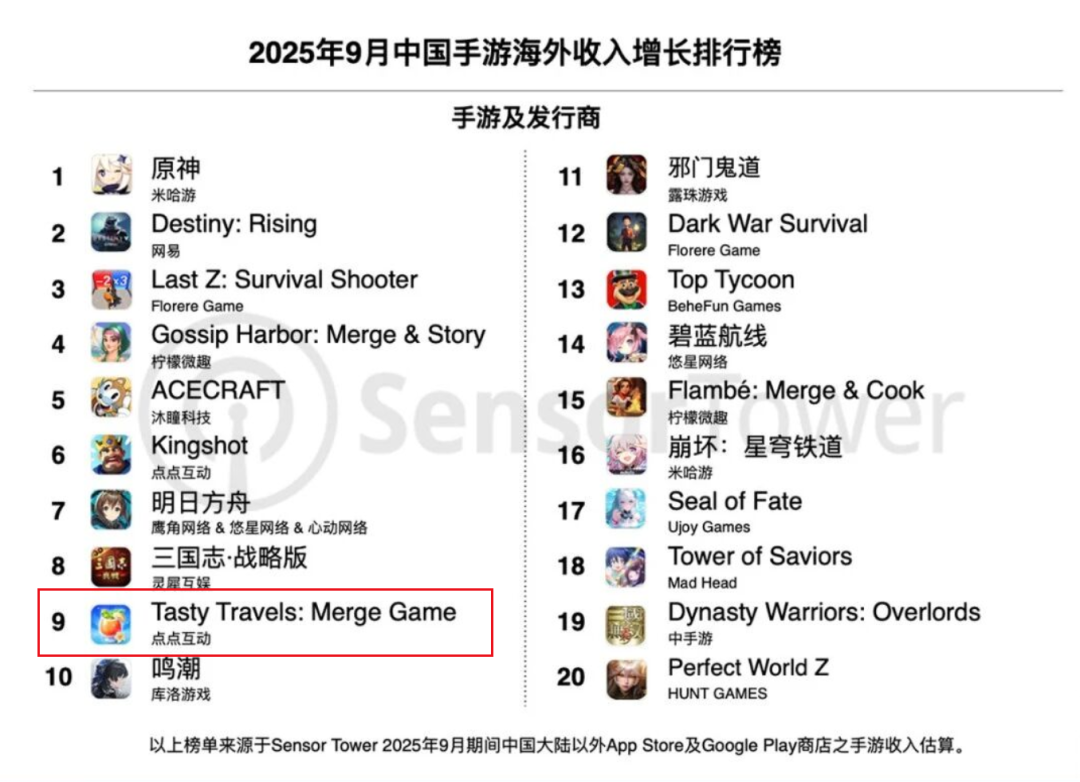 值得注意的是,榜单中Century Games旗下另一款“环游世界+美食烹饪”题材合成手游《Tasty Travels:Merge Game》保持了强劲增长势头,9月收入环比再涨26%,跃升至增长榜第9名,同时在收入榜排名提升4位至第19名,彰显Century Games在合成手游领域的成功布局与市场竞争力。