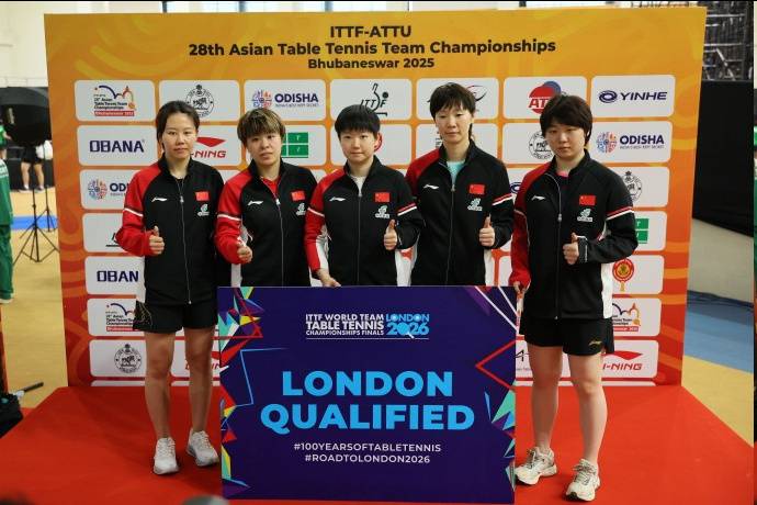 国乒女团在2025年亚锦赛中稳步晋级,成功锁定2026年伦敦世乒赛团体赛入场券。孙颖莎 、王曼昱 、王艺迪 、陈幸同 、蒯曼拍摄合照。祝贺!