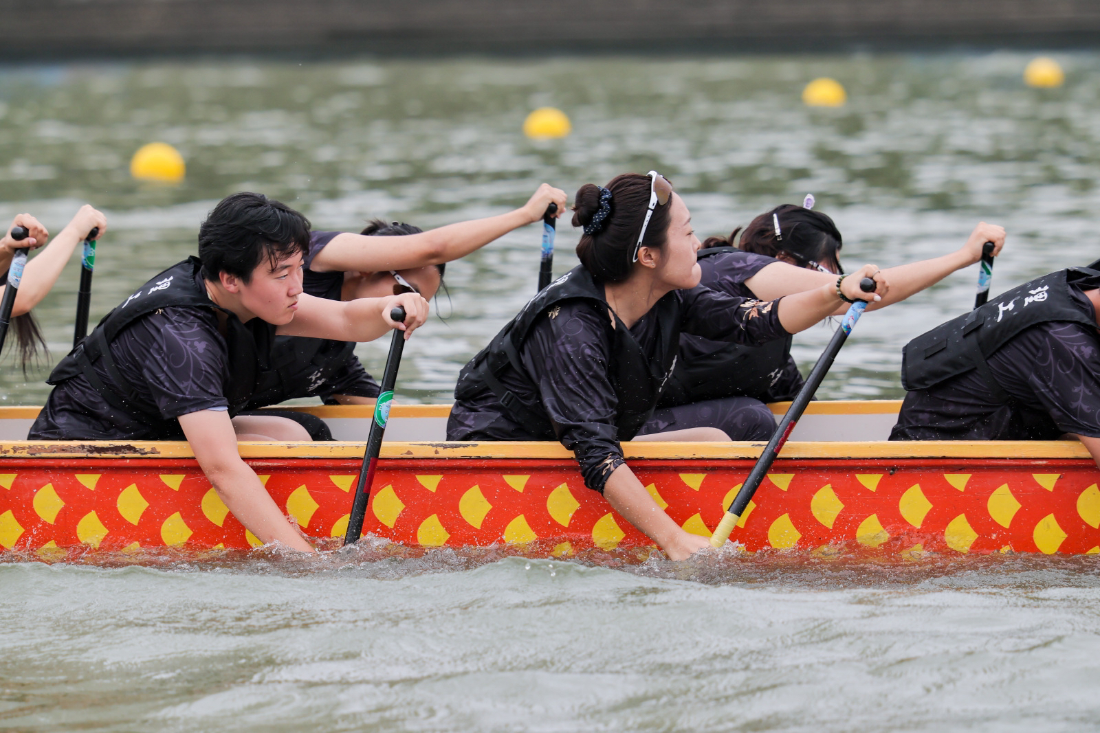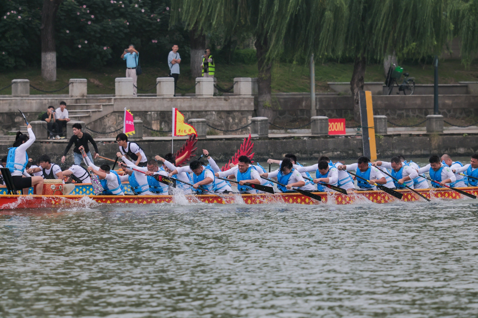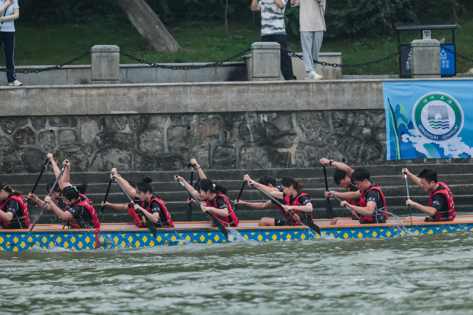 12日上午河畔三级平台人流如织,沿线观众欢呼喝彩不断,一艘艘龙舟如离弦之箭,逐浪劈波,在200米直道竞速、500米直道竞速两个赛项展开激烈角逐。铿锵的鼓点间,划手们奋力挥桨,浪花四溅,充分诠释了龙舟文化的传承和勇立潮头的奋斗精神;行进的龙舟旁,江苏省电视塔、石头城遗址公园等城市文旅地标是绝佳的背景板,彰显了古都南京的历史底蕴与城河共生的滨水活力。