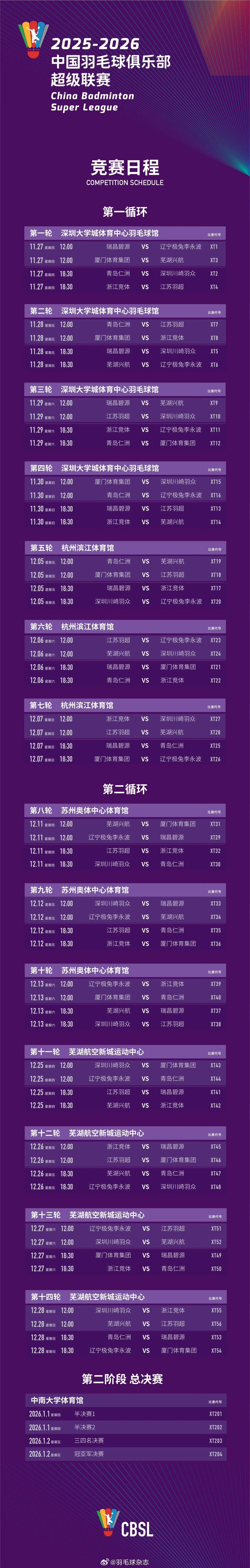 新赛季羽超联赛延续5场制混合团体赛制,涵盖男单、女单、男双、女双、混双五个项目,赛事分为常规赛与总决赛两个阶段。常规赛采用双循环赛制共14轮,将依次在广东深圳、浙江杭州、江苏苏州、安徽芜湖四地举办,其中深圳承办揭幕阶段赛事,杭州滨江体育馆将于12月5日至7日迎来第5-7轮对决,苏州赛区接续承办后续赛事,安徽芜湖航空新城运动中心则将在12月25日至28日上演循环赛收官战。常规赛排名前4的俱乐部将晋级长沙总决赛,争夺联赛最高荣誉。