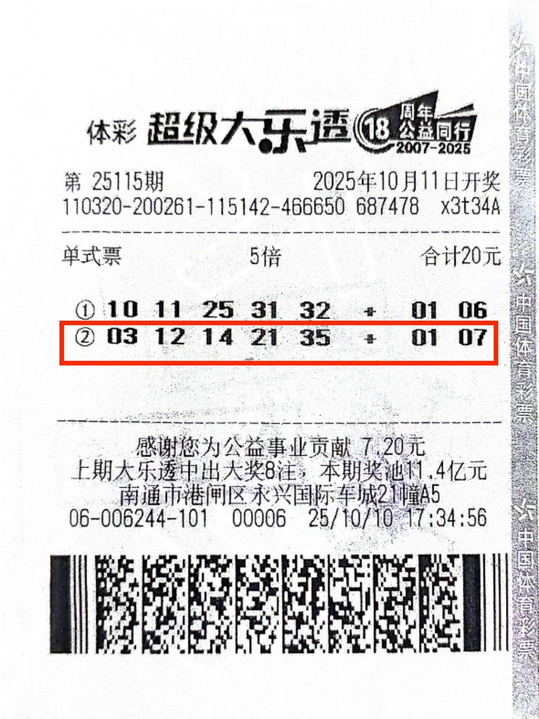 10月11日,南通3206006244网点购彩者张先生凭借一张20元的单式票收获体彩大乐透第25115期5注二等奖,总奖金达116万元。近日,张先生现身江苏省体彩中心兑奖大厅,领走了这份幸运。