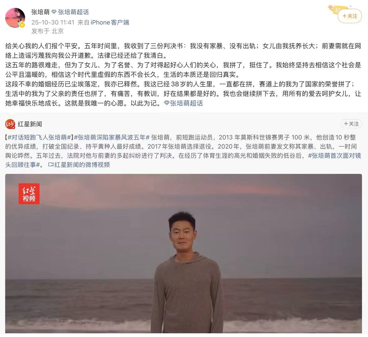 北京时间10月30日,已经退役的短跑名将张培萌更新社媒,谈及他与前妻的官司。张培萌在社媒写道:“给关心我的人们报个平安。五年时间里,我收到了三份判决书:我没有家暴、没有出轨;女儿由我抚养长大;前妻需就在网络上造谣污蔑我向我公开道歉。法律已经还给了我清白。