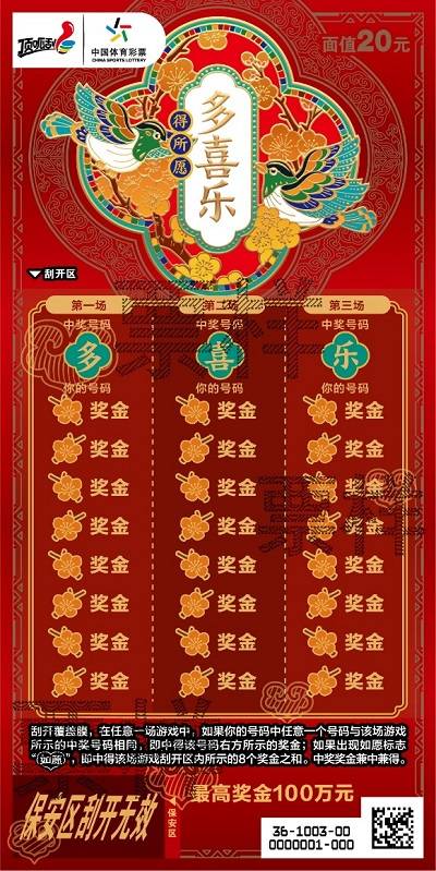2025年转眼已接近尾声,又到了互送祝福的时刻!多喜乐、长安宁、岁无忧、久安康……都是充满美好寓意的常用祝福语。体彩顶呱刮推出“得所愿”主题即开票,以这四个融合了中国传统文化底蕴的祝福语为主题,通过典雅华丽的票面、丰富有趣的玩法,为购彩者送来美好祝福,愿大家所得皆所愿。与此同时,江苏体彩针对20元面值“得所愿”即开票开展“好运得所愿,益起大乐透”活动,为广大购彩者送上多重幸运!