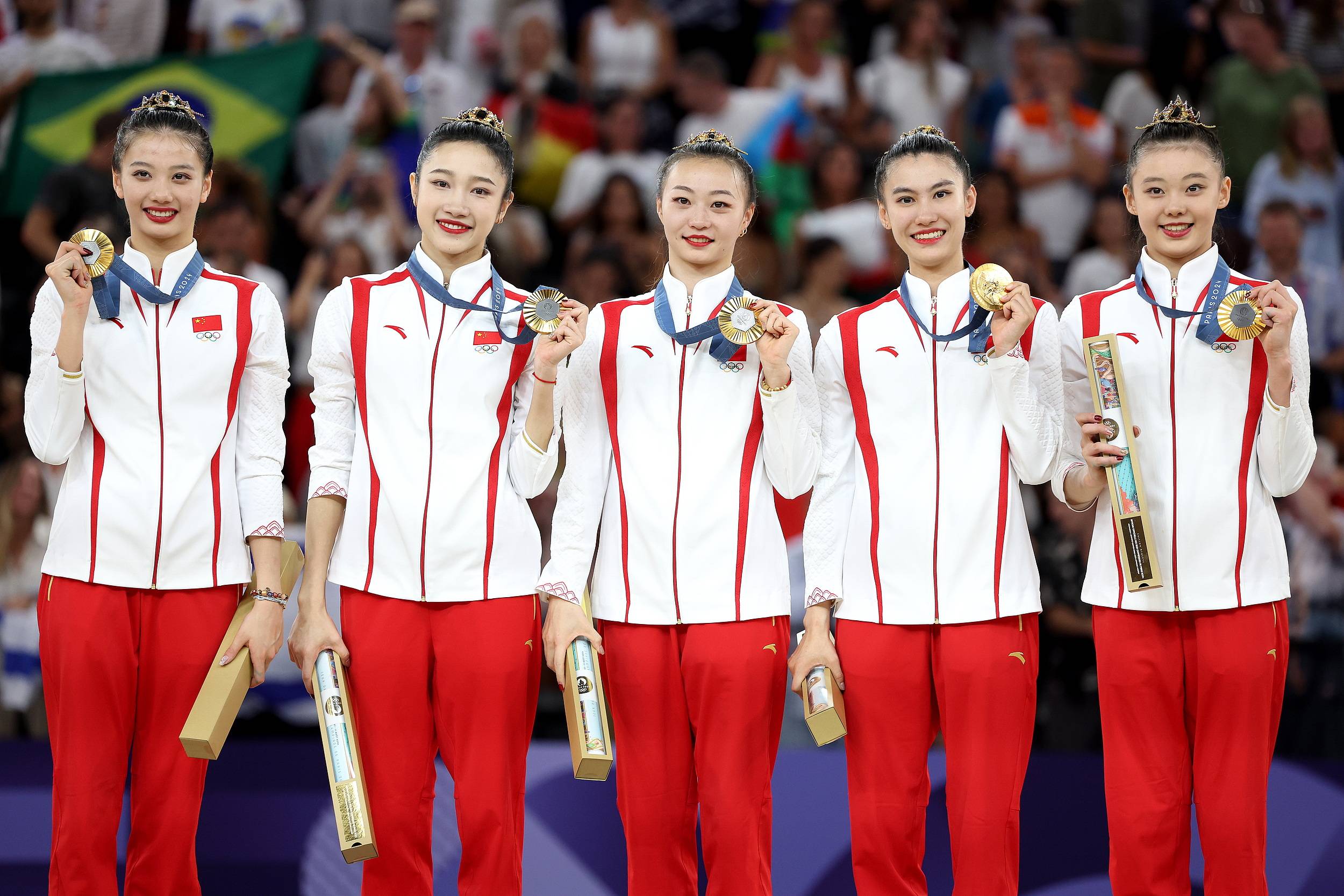 郝婷(左三)和队友在巴黎奥运会领奖台上。
