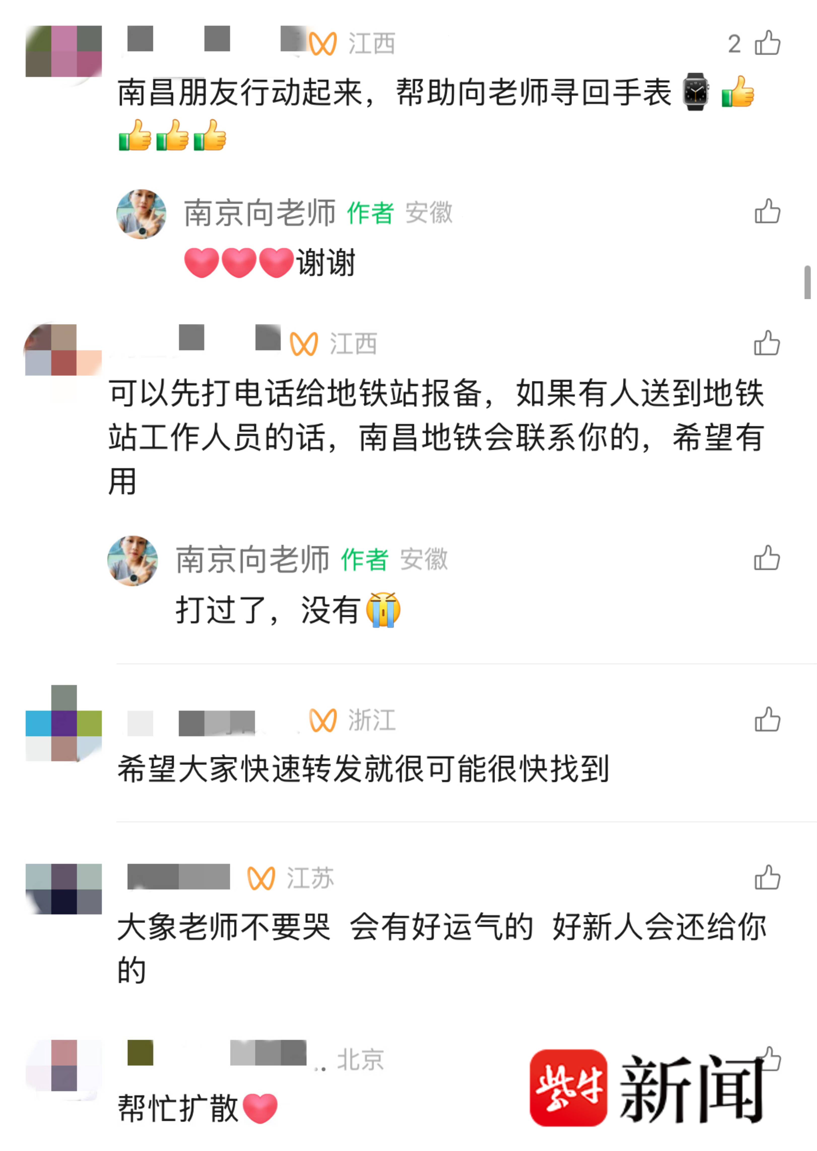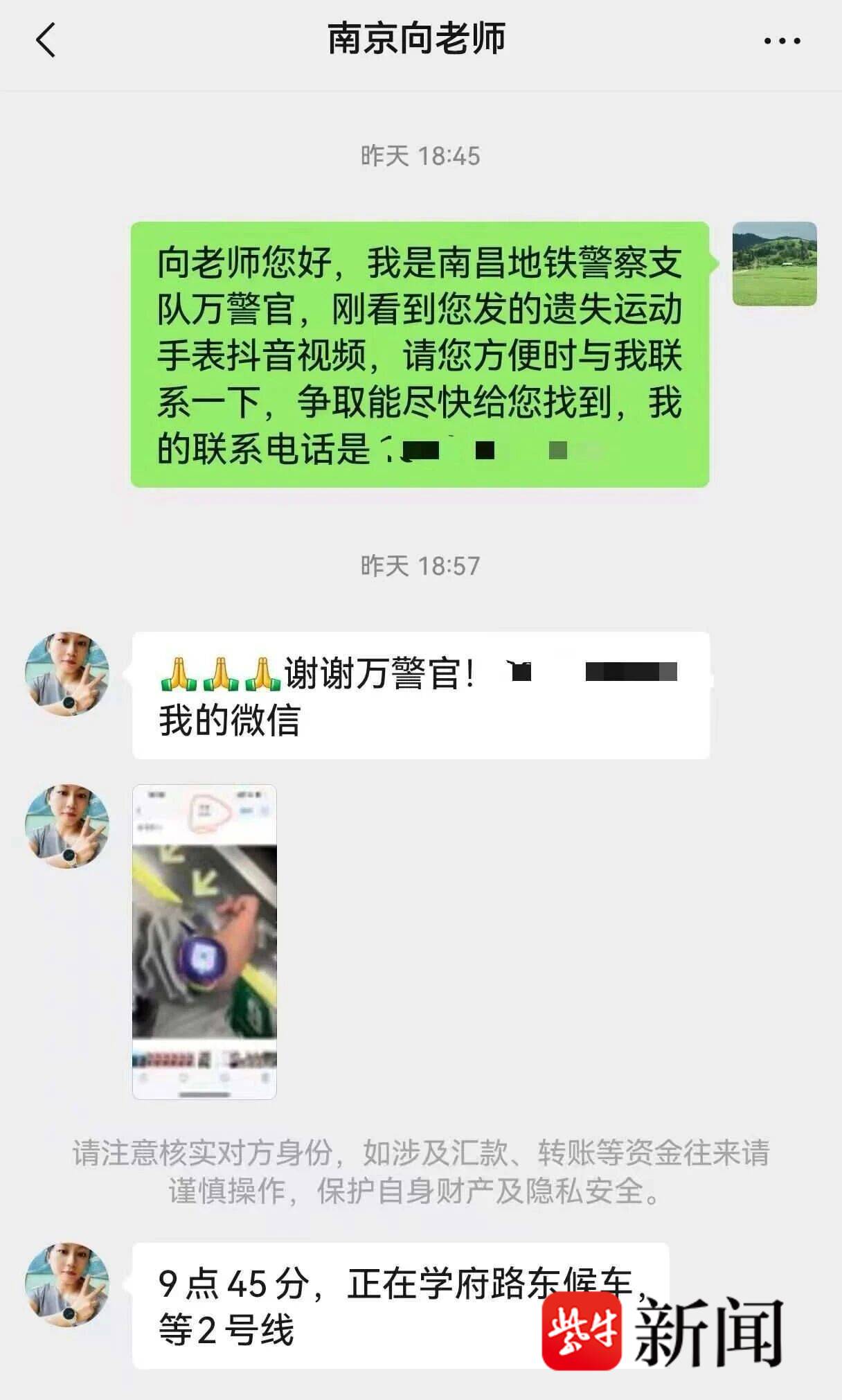 “当晚在南昌到南京的高铁上,我就看到微信视频后台有地铁警官的留言,让我及时联系他。”突如其来的回应让濒临失望的向先重燃希望,她立刻将自己乘坐地铁的时间、手表特征等信息告知地铁警方,配合排查工作。