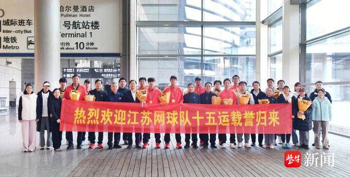 11月20日下午,南京禄口国际机场出站通道内气氛热烈。刚刚在第十五届全国运动会上载誉归来的江苏省网球队全体运动员、教练员及管理保障团队,在抵达南京的第一时间,就迎来了母校南京体育学院师生真挚的欢迎。校领导也来到现场,向全体队员、教练及后勤人员送上鲜花,表达对他们辛勤付出与卓越成绩的肯定。