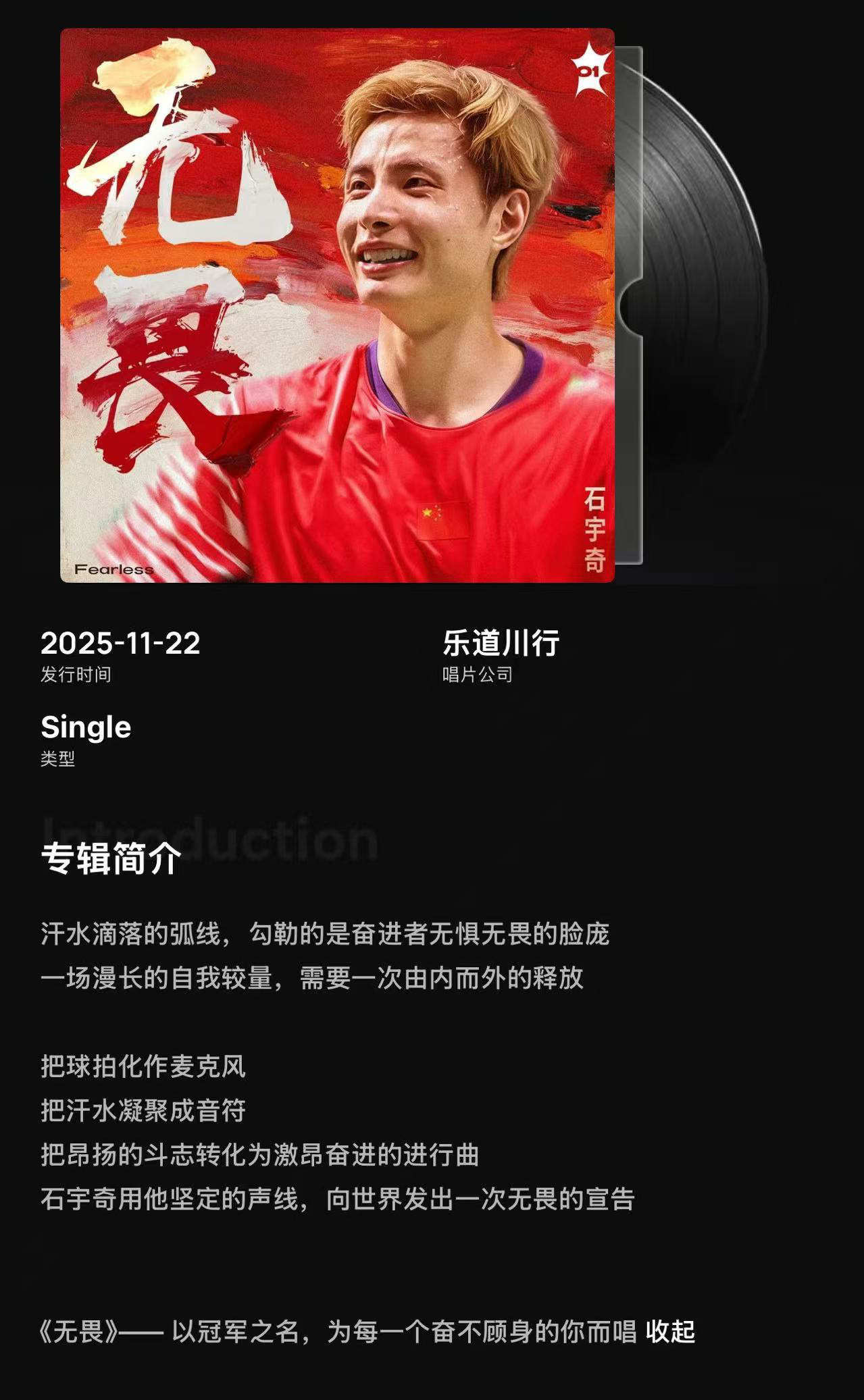 时隔半年,羽毛球世界冠军石宇奇在助力江苏男羽斩获全运会团体金牌后,于11月22日全网首发首支原创单曲《无畏》,成为跨界标杆之作。“我将夺回失去的荣耀,无畏地宣告”的核心歌词,精准映射出他历经伤病、禁赛低谷后重返世锦赛冠军领奖台的职业生涯。其颇具辨识度的嗓音与真挚情感,让歌曲被粉丝称赞为“华羽乐坛的新希望”,更与他全运会江苏代表团闭幕式旗手的身份形成呼应,进一步扩大社会影响力。