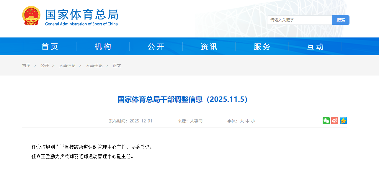 国家体育总局任命王励勤为乒乓球羽毛球运动管理中心副主任。