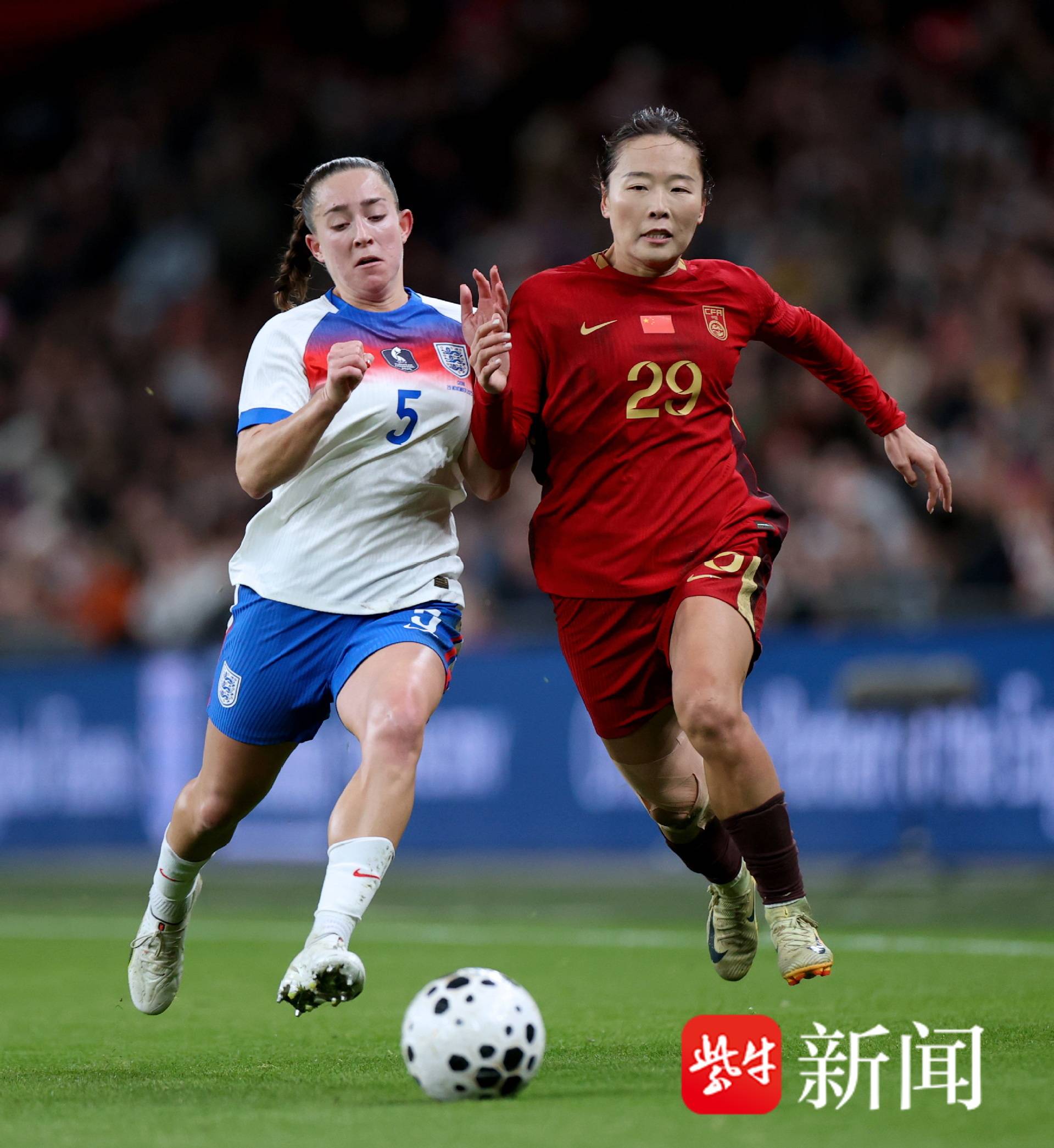 乌日古木拉(右)与英格兰队球员勒蒂西耶拼抢。
