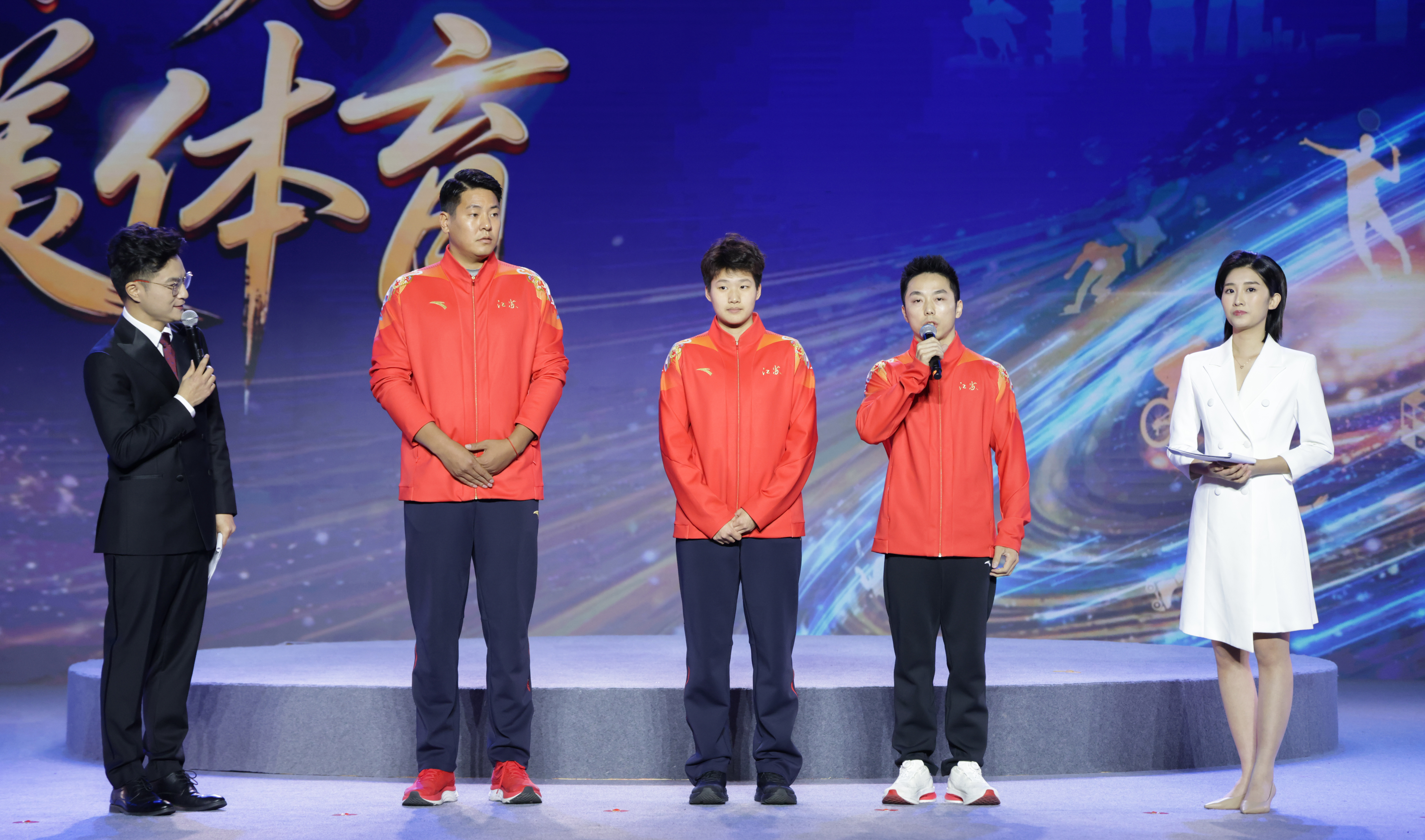 活动开场,第十五届全运会体操冠军尤浩、游泳冠军吕沁遥、赛艇冠军臧哈便登台分享全运荣耀与心路历程,迅速点燃现场氛围。《看!这是我们的赛场》再现群众赛事全民参与的火热场景,《体育的烟火气》以博主视角展现江苏城乡处处可健身的活力画卷,《逐梦者的力量》则通过情景剧诠释了江苏体育人坚守梦想、奋勇拼搏的精神内核。