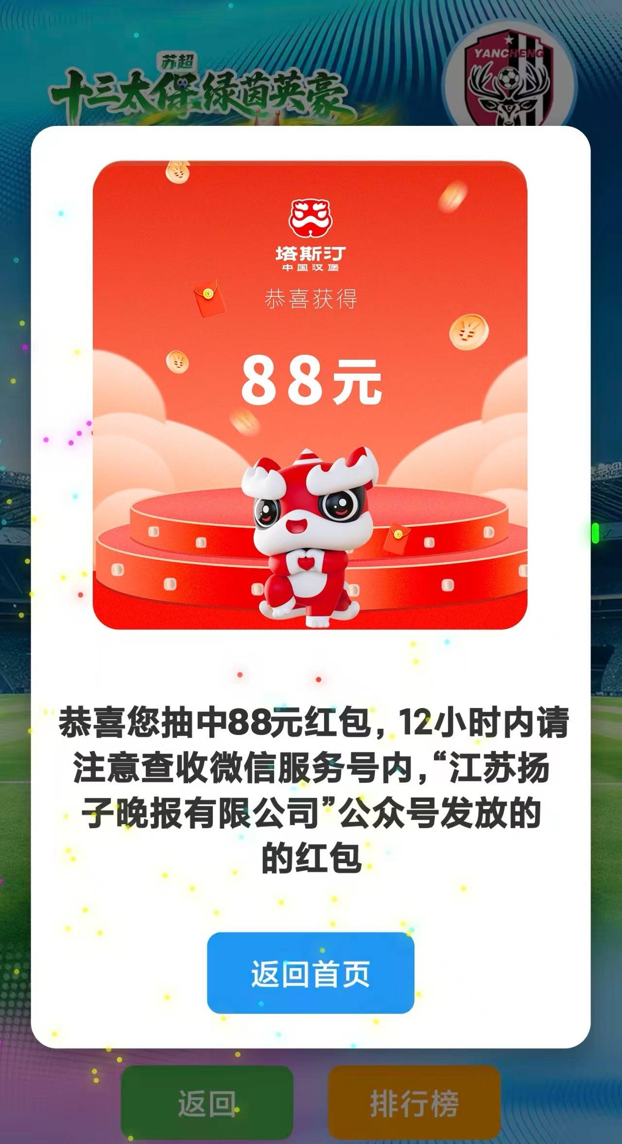 本次由扬子晚报·紫牛新闻主办的评选活动自开启以来,全省13个地级市球迷热情高涨。投票福利多多,小编每天睁眼就是拼手气! 活动期间,每日投票即可参与抽取88元、5元、1元三种现金红包,小编已经连续两天中奖5元,手气爆棚!快为你支持的城市人气王投上宝贵一票,下一个幸运儿就是你!别忘了,线下投票同样重要! 全省13市海尔指定门店已设置投票站,不仅有专业服务,还提供暖心手工水饺。