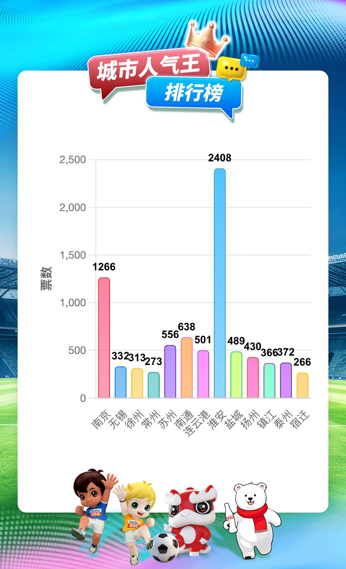 12月14日启动的2025苏超“十三太保·绿茵英豪”城市人气王评选活动热度持续攀升!截至今日(12月16日)14点,投票数据令人惊喜:淮安以2408票一马当先,将南京(1266票)和南通(638票)远远甩在身后。还记得苏超联赛中,淮安队虽位列八强,却总是被调侃“保底季军”,如今在人气王投票中终于扬眉吐气,用实力证明了什么叫“莫欺少年穷”。而南京与南通这对“老冤家”,联赛中你追我赶,如今又在投票榜上展开“南哥之争”,南京暂时领先南通两倍多的票数,但南通球迷纷纷表示“绿茵场上我们第一,投票我们也要争第一”!