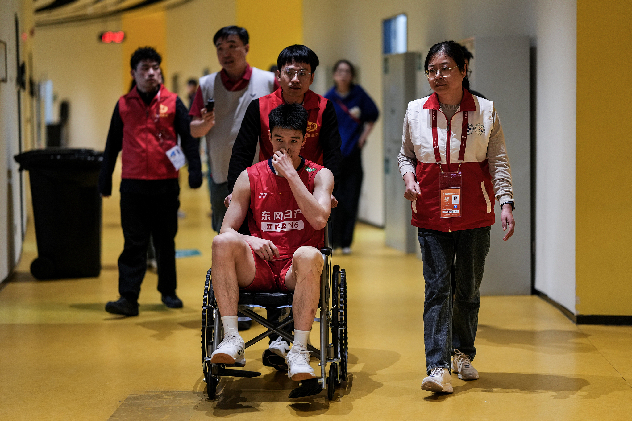 羽毛球年终总决赛|突发伤情!李诗沣扭伤右脚踝无法动弹 坐轮椅退赛