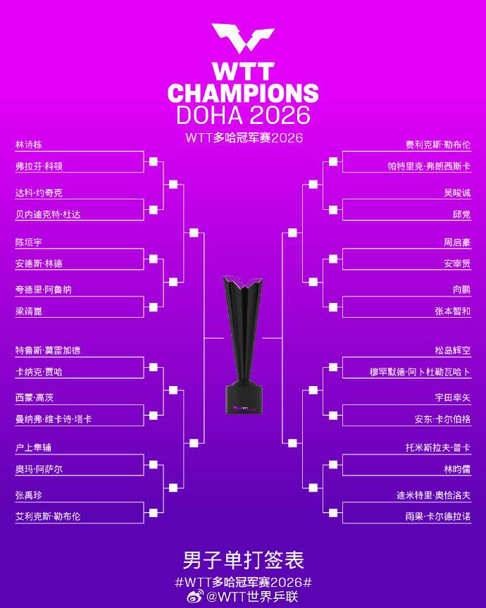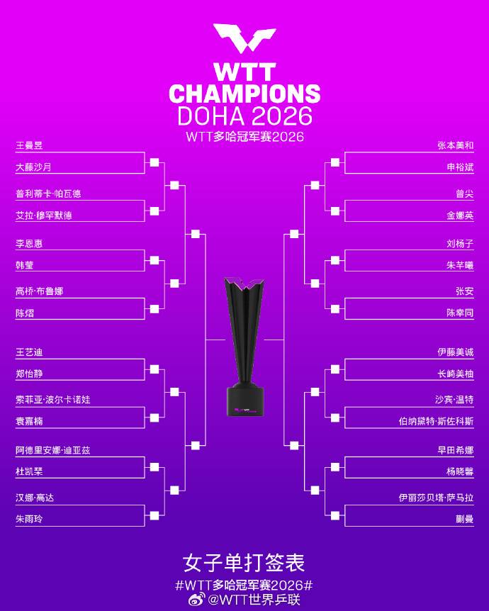 2026年1月5日,WTT多哈冠军赛抽签结果尘埃落定,作为新赛季WTT系列赛的揭幕战,这场顶级单打赛事将于1月7日至11日在卢赛尔体育馆展开角逐。国乒因孙颖莎、王楚钦缺席,以王曼昱、林诗栋为核心的国乒多人阵容出征,女单与男单呈现出截然不同的签运格局,女单包揽前四号种子且分散布局占得先机,男单则陷入扎堆困境,内战与强敌夹击并存,冲冠之路充满挑战。