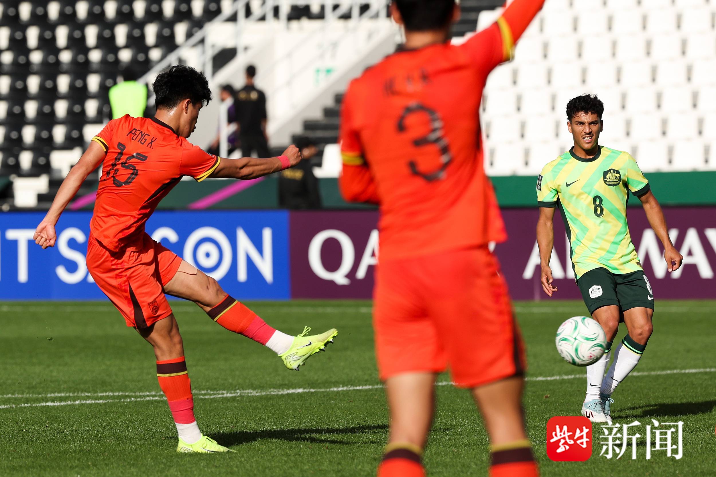 比赛第43分钟,王钰栋开出定位球,澳大利亚球员解围失误,彭啸在点球点附近左脚凌空爆射破门,中国队上半场第一次射门即收获进球。