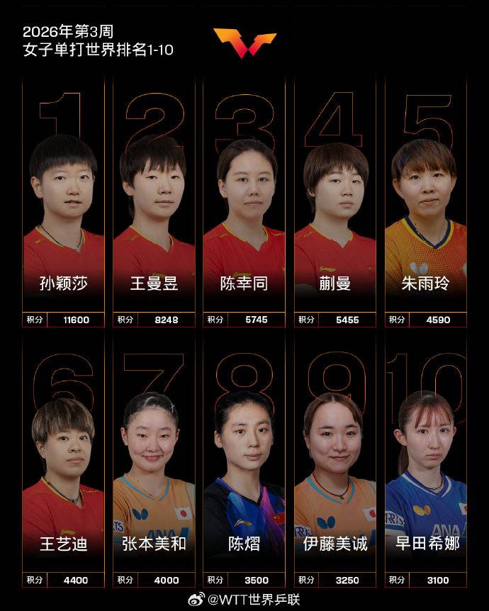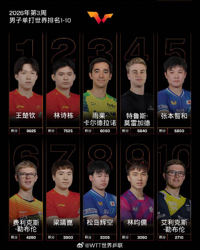 1月12日,国际乒联2026年第3周世界排名榜单正式公布。刚刚落幕的WTT多哈冠军赛成为本次排名变动的核心驱动力,赛事冠亚军及四强选手凭借赛事积分实现排名跃升,直接重塑了男女单打头部格局。
