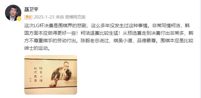 2024年1月,柯洁在LG杯决赛遭遇不公,聂卫平还曾为柯洁“出头”。他表示:这次LG杯决赛是围棋界的悲剧,这么多年没发生过这种事情。非常同情柯洁,韩国方面本应做得更好一些!柯洁退赛比较生猛!从预选赛走到决赛付出非常多,韩方不尊重棋手的劳动付出。陈毅老总说过,棋虽小道,品德最尊。围棋本应是比较绅士的运动。 扬子晚报/紫牛新闻记者 黄啟元 视频制作:孙梦遥