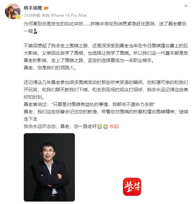战鹰在悼念文中写道:“为何离别总是发生得如此突然……昨晚半夜收到消息紧急赶往医院,送了聂老最后一程。”她坦言,自己走上围棋之路的根源,正是父亲深受聂老感染自学围棋,并坚定地为她选择了职业棋道。“我们这一代基本都是受聂老的影响,走上了围棋之路,坚定地选择要成为一名职业棋手。聂老,您是我们的领路人。”战鹰的心声,道出了无数新生代棋手的共同记忆。