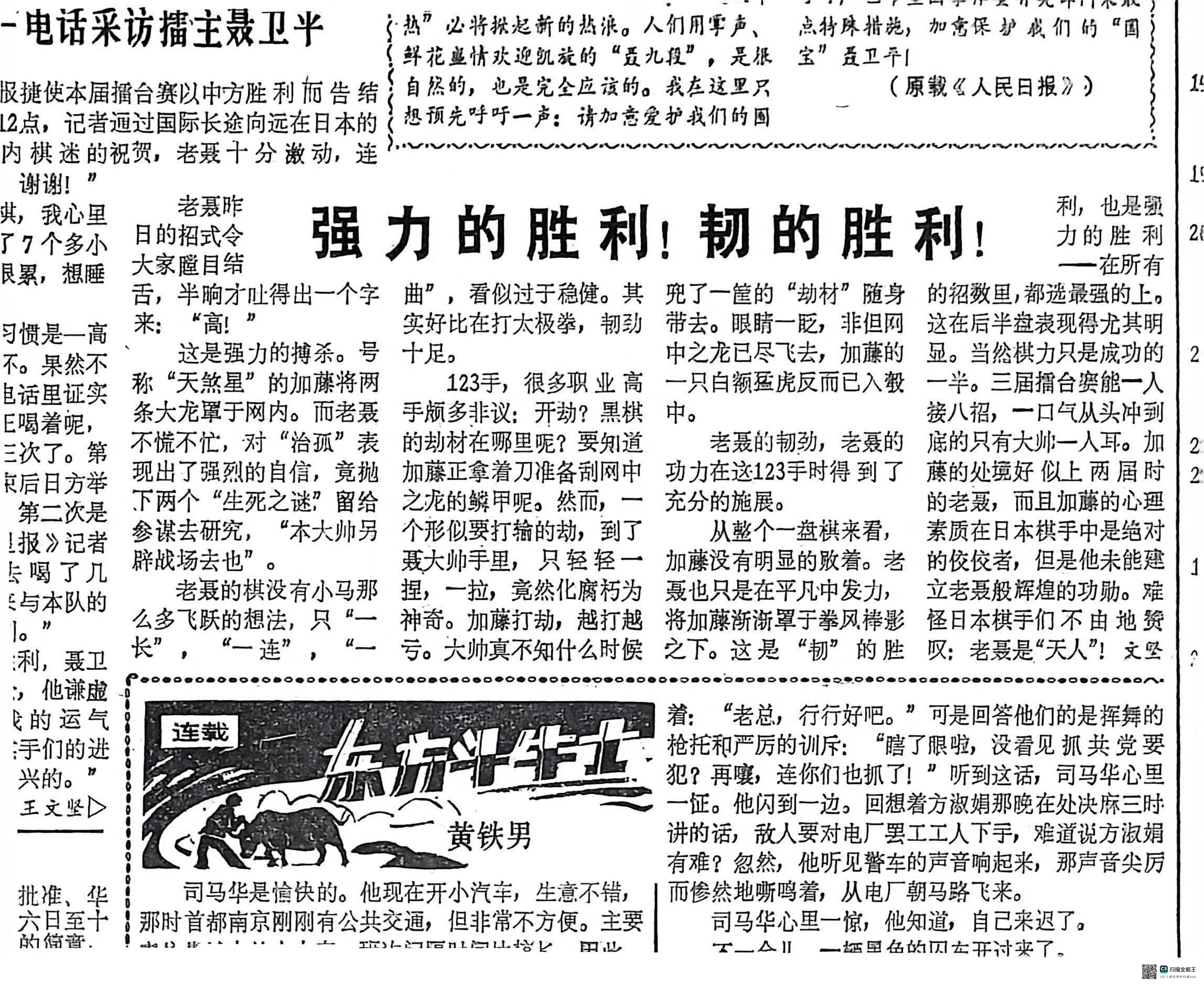 中日围棋擂台赛的11连胜,使老聂成为神一般的存在。我入职扬子晚报体育记者,正赶上了他的第9次凯旋。心潮澎湃的我写下了《强力的胜利!韧的胜利!》一文(附后),当时受到许多业内专家的击节称赏。现在看来,虽略显稚嫩,还算得上棋评中的上品。从此,我和许多围棋国手们结下了不解之缘。马晓春的轻灵聪慧、刘小光的沉稳豪迈、曹大元的大气幽默、杨晖的睿智豁达、邵震中的洒脱风趣都给我留下了深刻印象。