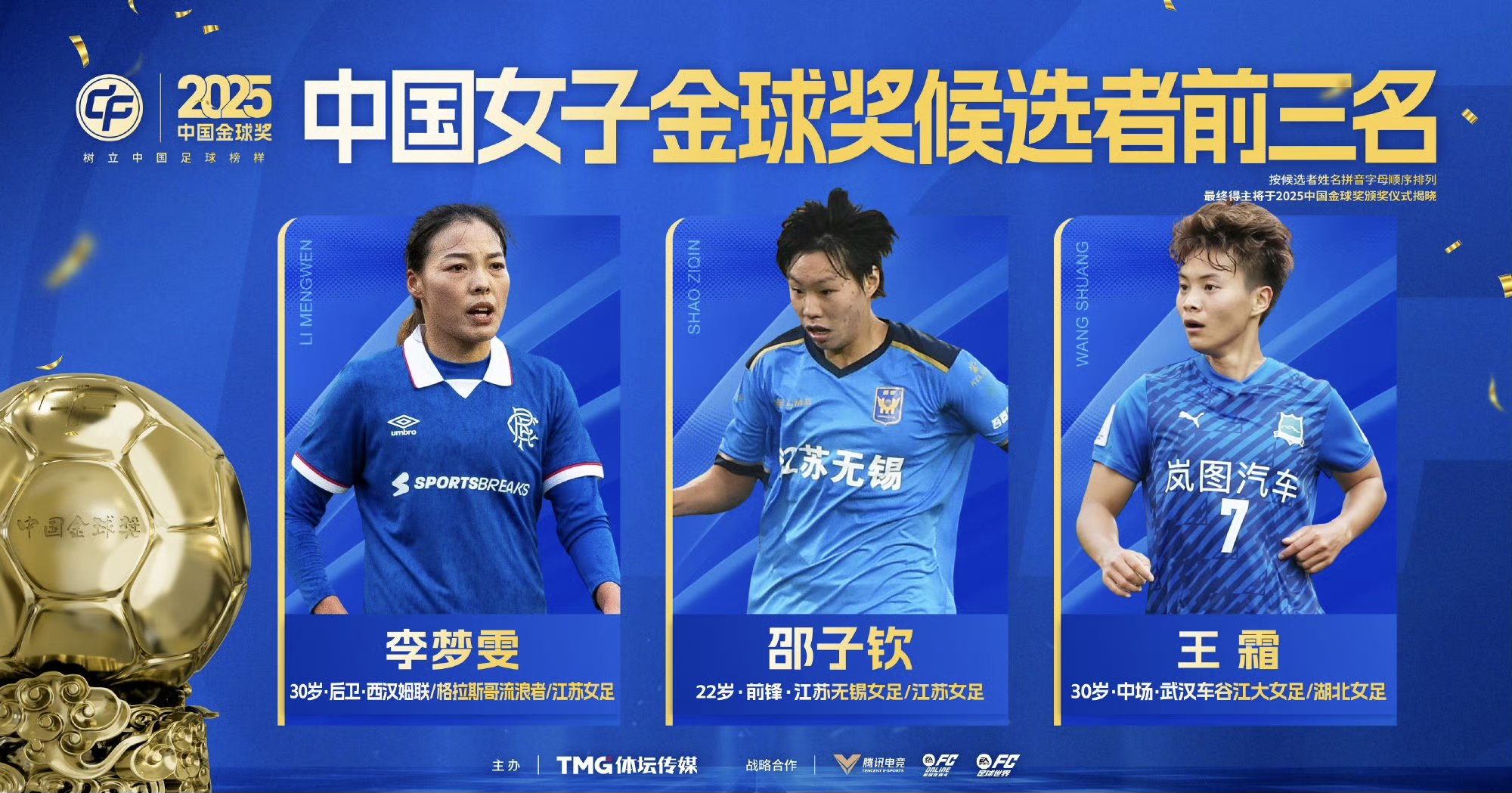 江苏女足两人跻身2025中国女子金球奖前三