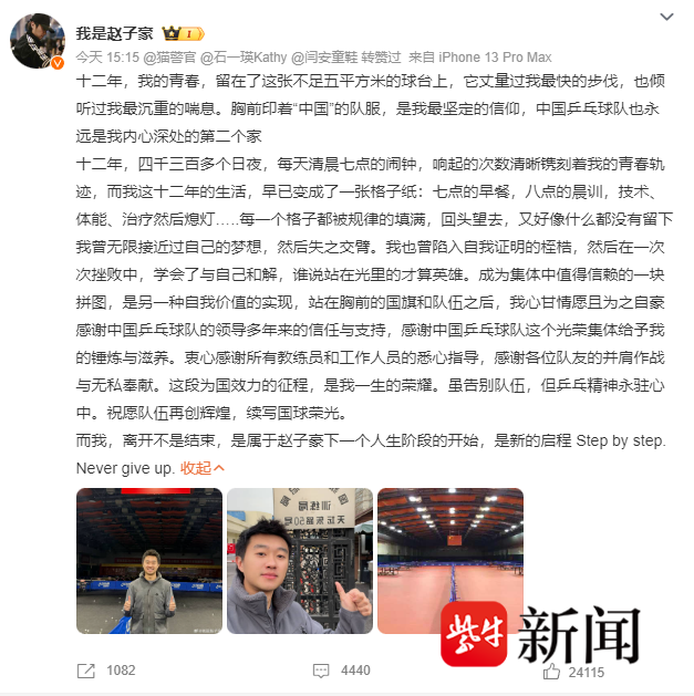 这位从南京走向国家队的的乒乓球选手,成长轨迹里始终带着江苏人踏实、坚韧的特质。如今告别国乒,他也以积极的姿态迎接未来,“离开不是结束,是属于赵子豪下一个人生阶段的开始,是新的启程”。正如他在文末写下的“Step by step. Never give up”,这位坚守直板的金陵健儿,将带着十二年国乒生涯沉淀的勇气、信念与团队荣光,在教练岗位上继续稳步前行,让乒乓热爱以另一种方式延续。
