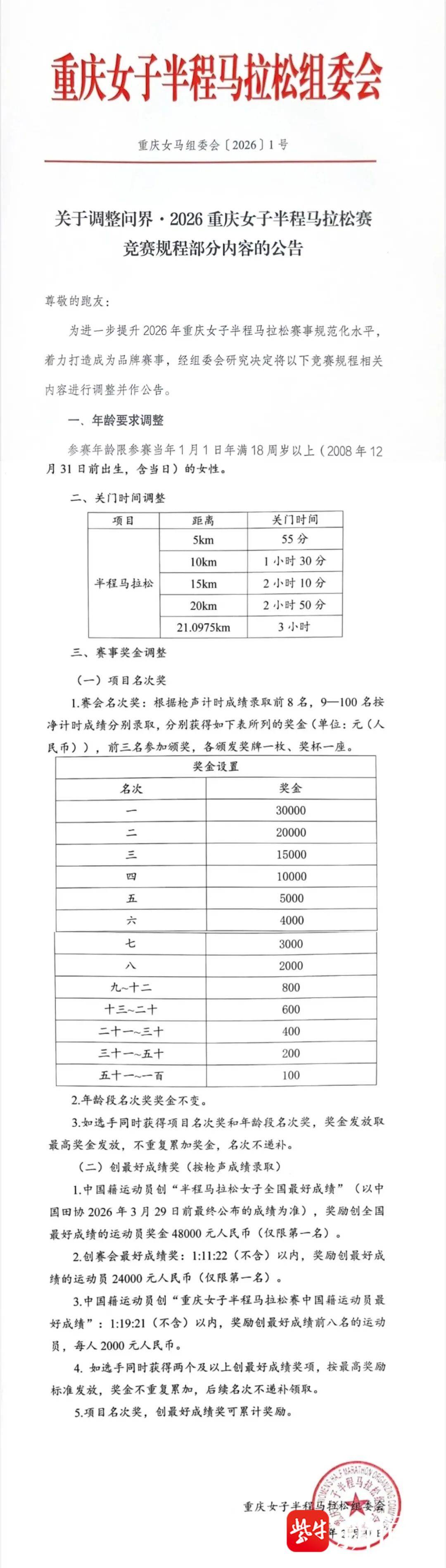 2月10日晚,2026重庆女子半程马拉松组委会发布官方公告,对赛事竞赛规程作出多项重要调整,核心涉及参赛年龄门槛、各赛段关门时间及赛事奖金体系,此次调整距赛事2月12日抽签结果公布仅两天,引发广大跑友热议,尽管新规没有正式出台,但马拉松赛事的组合和承办日趋成熟。