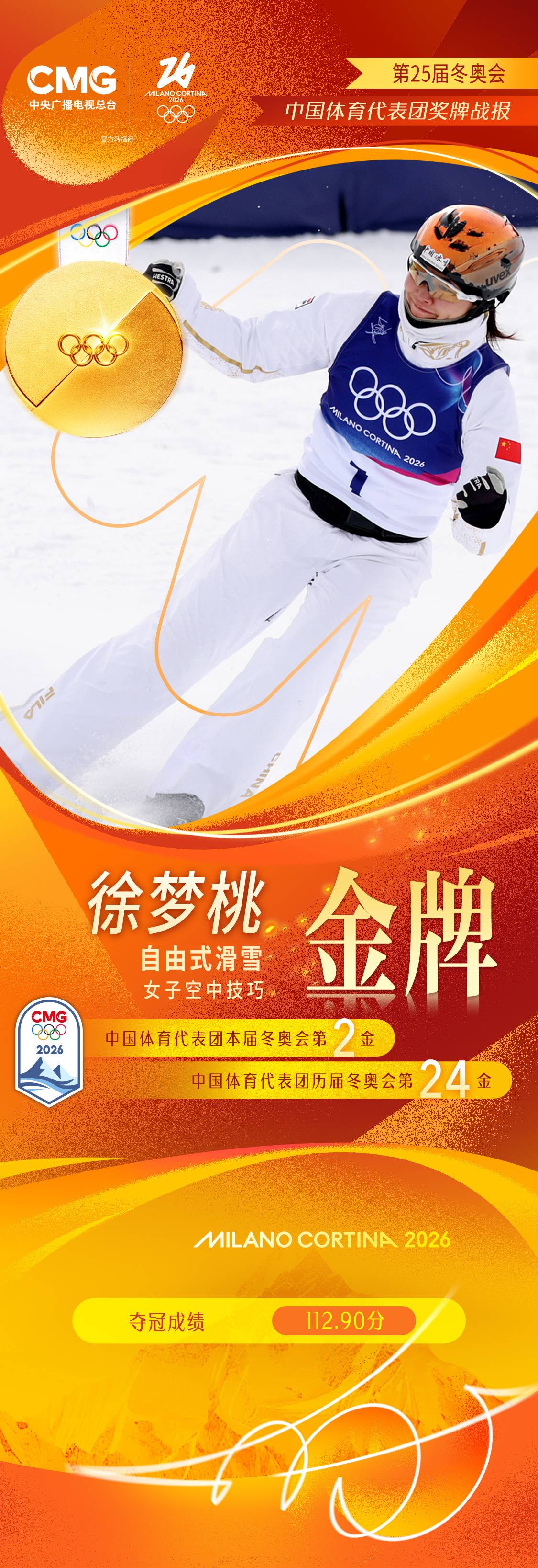 北京时间2月18日,在米兰-科尔蒂纳冬奥会自由式滑雪女子空中技巧决赛中,中国选手徐梦桃夺得金牌。这也是中国体育代表团在本届冬奥会收获的第二枚金牌。中国选手邵琪夺得铜牌。
