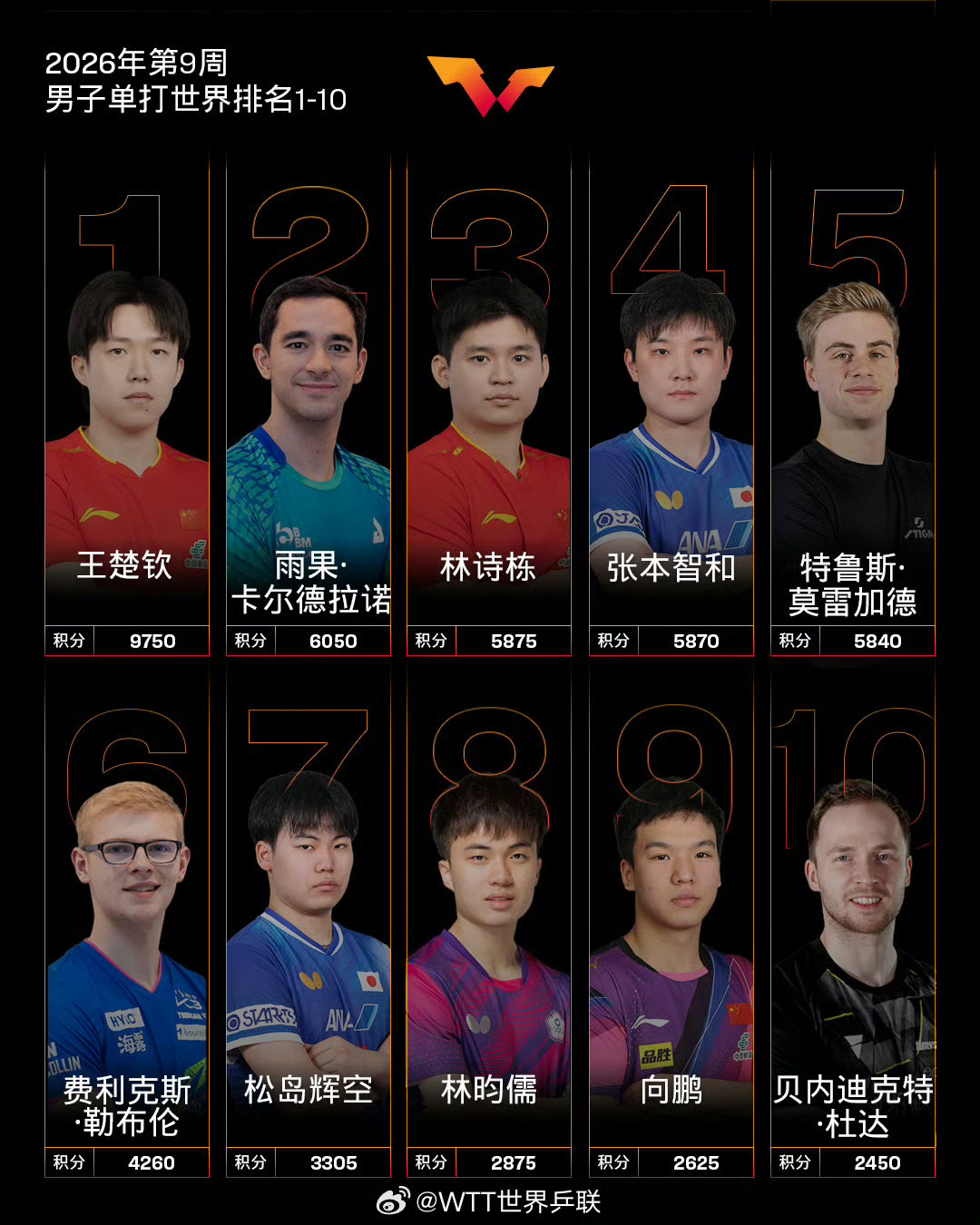 北京时间2月23日,国际乒联公布2026年第9周世界排名。本期榜单男单排名出现明显变化,王楚钦稳居榜首,林诗栋因部分积分到期从第二降至前三,梁靖崑因伤病缺席多场赛事,排名下滑至第12位。女单方面,国乒依旧包揽前列。