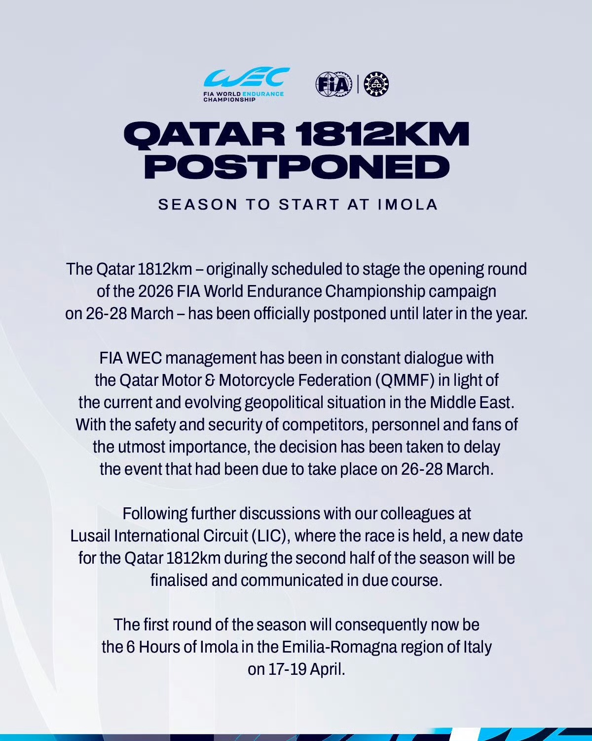 WEC 率先发布公告,宣布推迟揭幕战时间