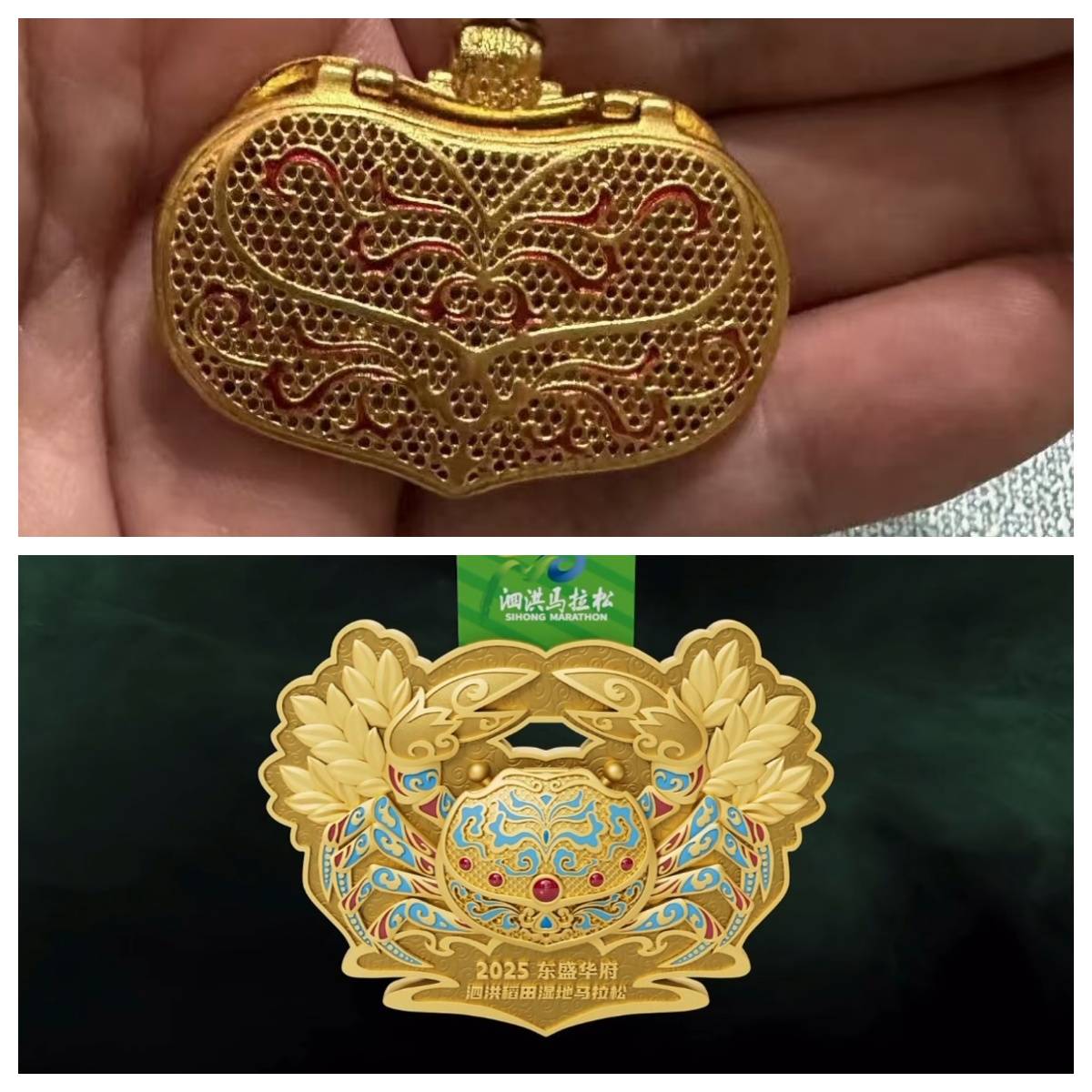 那么多奖牌设计,创意从哪来呢?胡松的答案是来自生活的点点滴滴。泗洪马拉松的螃蟹奖牌,就是他从儿子从小佩戴的金锁里找到了灵感,“之前的螃蟹奖牌总少点味道,看到长命锁的造型,突然觉得特别适合做螃蟹盖,还能设计成可掀开的样式,里面放选手信息,就像吃螃蟹掀盖一样。” 这一生活发现引发的灵感,胡松看在眼里、映入脑海又跃到了画纸上,最终结合珐琅漆工艺,打造出了趣味性和互动性十足的螃蟹奖牌。