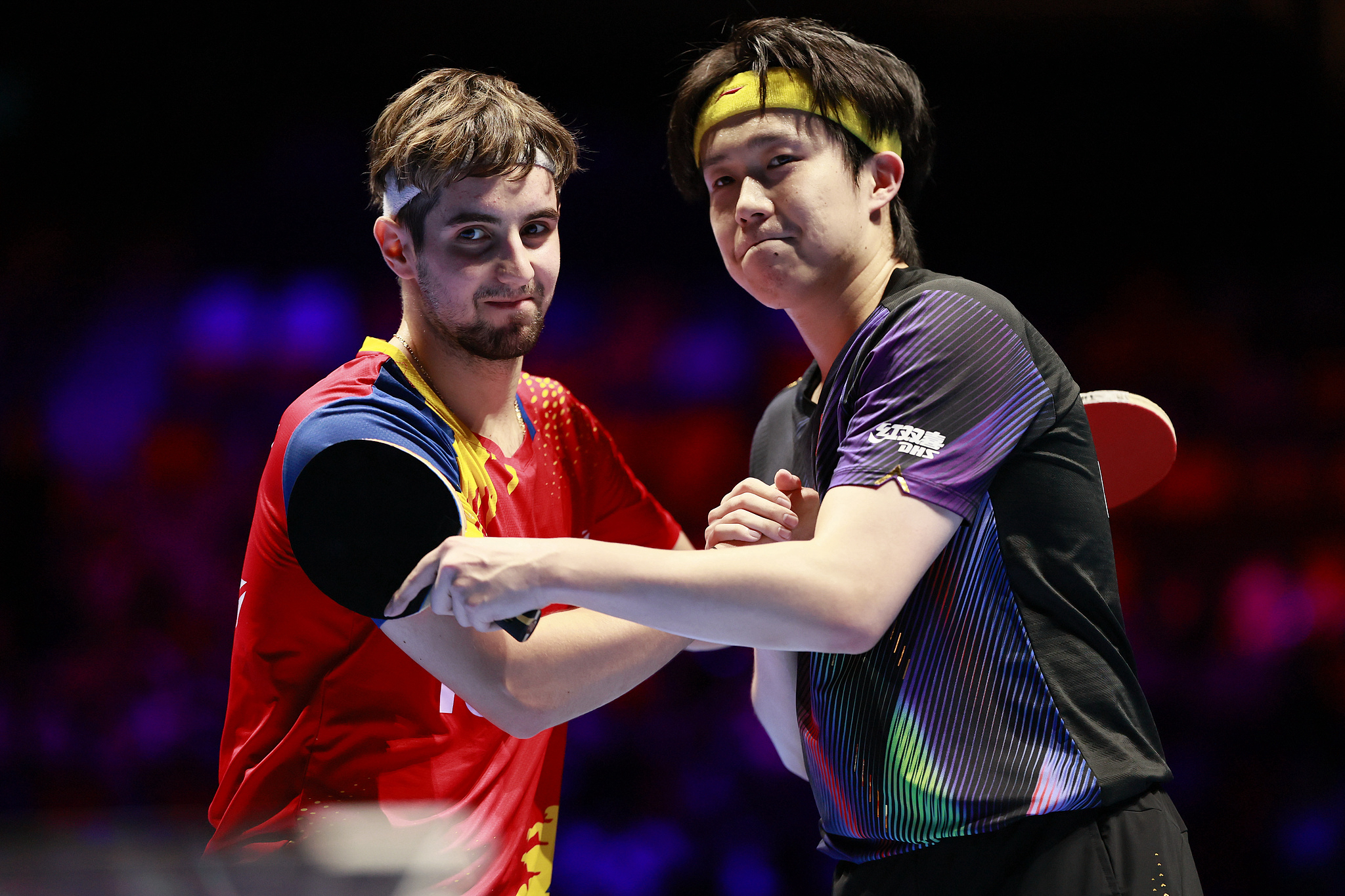 王楚钦(右)拿下单打世界杯首秀。CFP供图