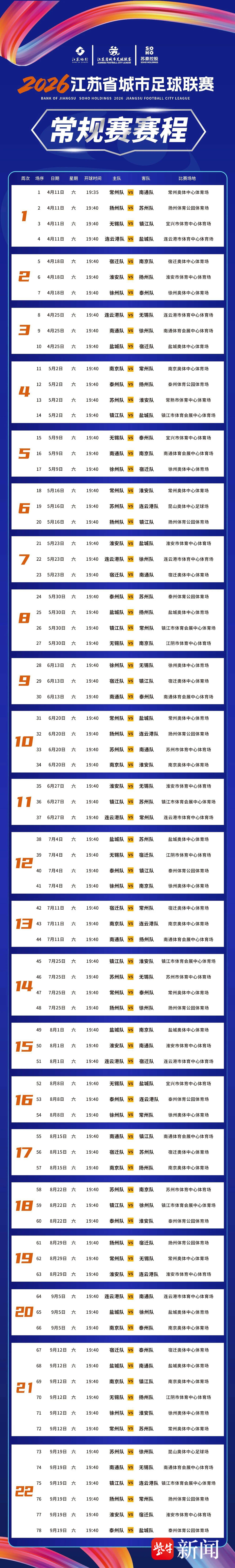 4 月 2 日,2026江苏省城市足球联赛(以下简称“苏超”)常规赛赛程正式发布。