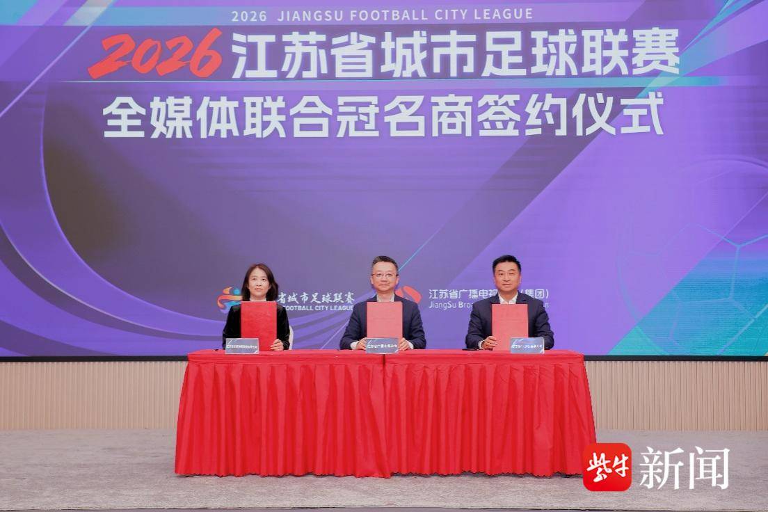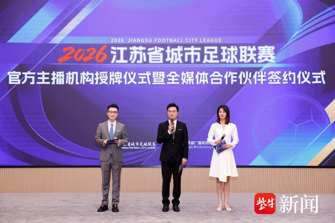 “苏超”新赛季开赛在即,江苏省广播电视总台作为唯一公用信号服务机构,将继续向全国各大媒体提供标准统一、制作精良的公用信号。活动现场,江苏省体育产业集团党委书记、董事长、江苏省体育总会副会长顾晔与江苏省广播电视总台党委委员、副台长、集团副总经理何可一完成2026江苏省城市足球联赛官方主播机构的授牌仪式。