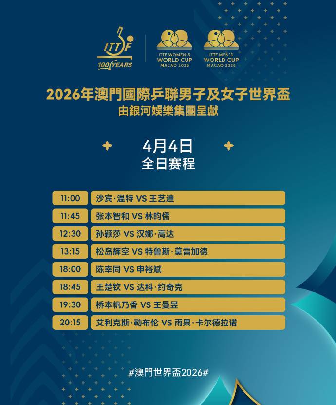 国际乒联单打世界杯将进行1/4决赛争夺 今日赛程一览