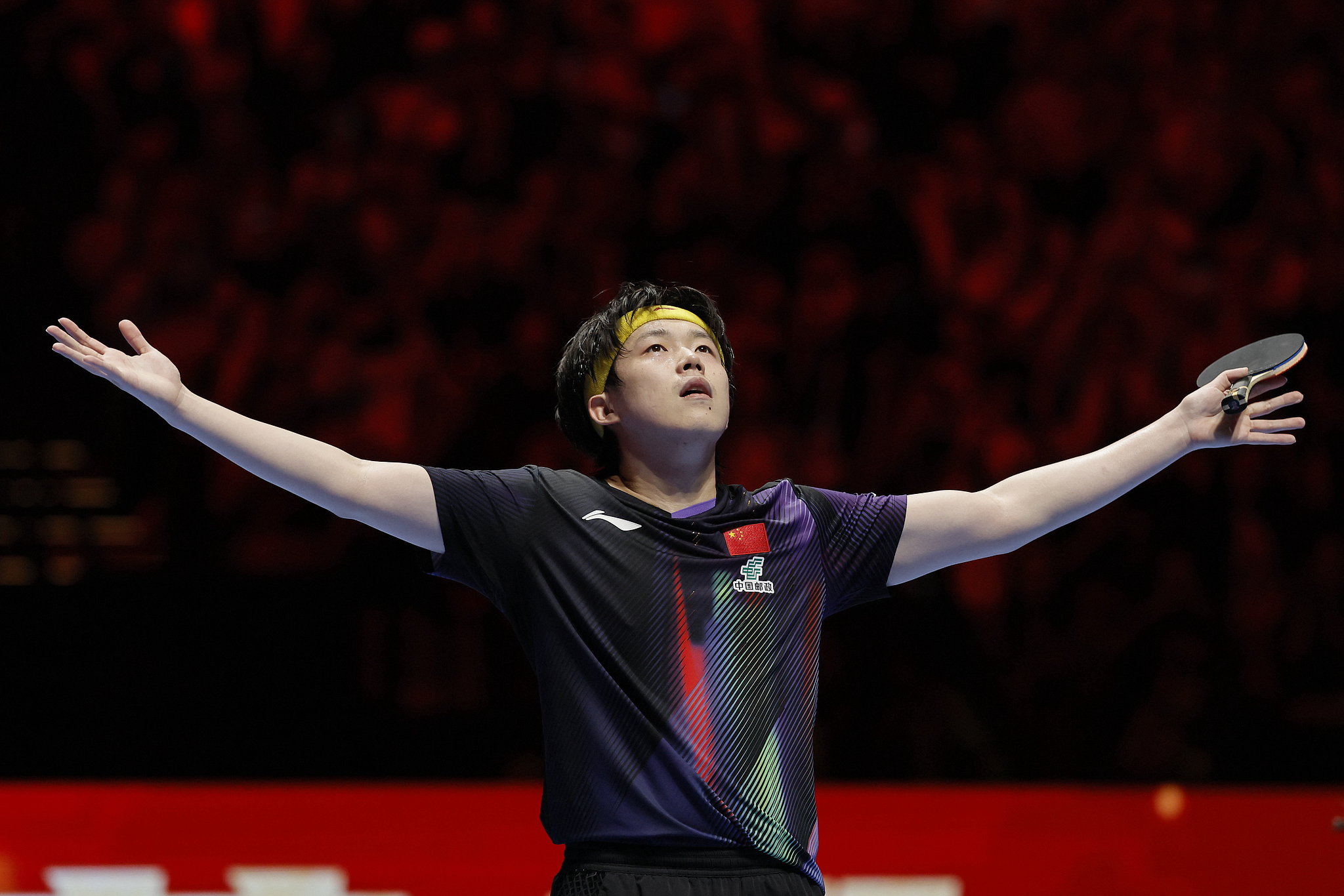 王楚钦张开双臂拥抱胜利。 CFP供图