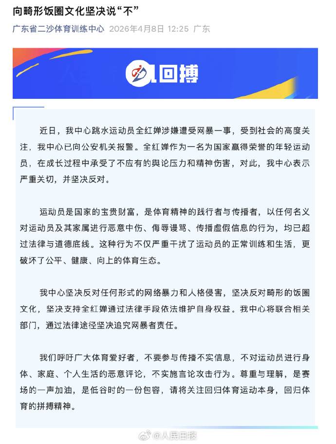 4月8日,广东省二沙体育训练中心正式发布公告,就跳水奥运冠军全红婵涉嫌遭受网络暴力一事,明确已向公安机关报警。随后,国家体育总局游泳运动管理中心迅速跟进发布声明,强烈谴责网暴行为,坚决支持全红婵通过法律手段维护合法权益。相关词条同步登顶微博热搜,截至发稿前阅读量已突破1亿,引发全社会广泛关注与强烈愤慨。