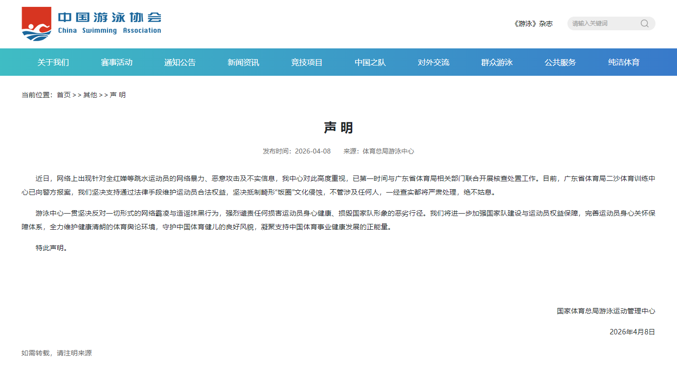 同日,国家体育总局游泳运动管理中心发布声明,对针对全红婵等跳水运动员的网络暴力、恶意攻击及不实信息高度重视,已第一时间与广东省体育局相关部门联合开展核查处置工作,明确支持广东省二沙体育训练中心的报警行为,坚决支持运动员通过法律手段维护自身合法权益。声明指出,将坚决抵制畸形“饭圈”文化侵蚀,无论涉及任何人,一经查实都将严肃处理、绝不姑息,同时将进一步加强国家队建设与运动员权益保障,完善身心关怀体系,全力维护健康清朗的体育舆论环境,守护中国体育健儿的良好风貌,凝聚支持中国体育事业健康发展的正能量。