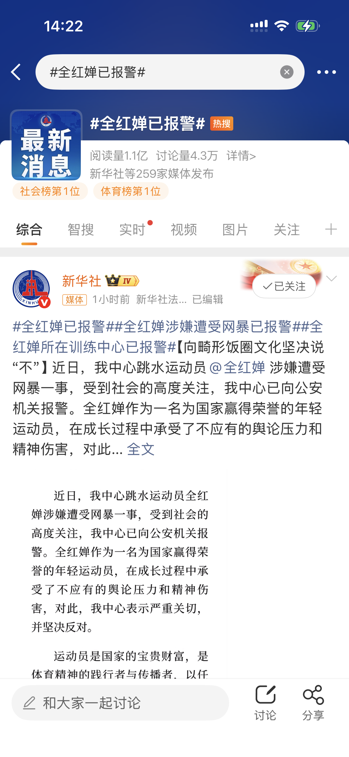 #全红婵已报警#话题阅读量迅速突破1.1亿。