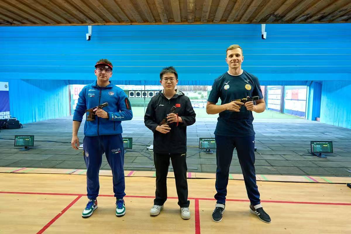 男子25米手枪速射决赛的剧情更加跌宕起伏。20岁中国小将杨宇浩在前两组射击后排在末位,濒临淘汰,但他随后渐入佳境,稳扎稳打,第7组结束后排名上升至并列第一。最终,杨宇浩以31中的成绩夺冠,并追平了该项目世界纪录。