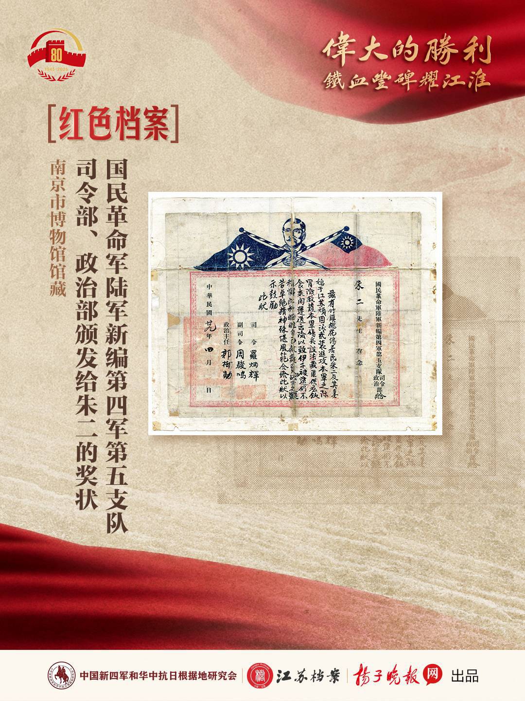 伟大的胜利·铁血丰碑耀江淮56|国民革命军陆军新编第四军第五支队司令部、政治部颁发给朱二的奖状