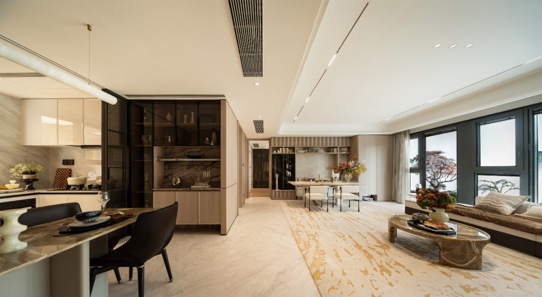 ·首个四代奢宅:以“零公摊”理念、空中岛屿、错层露台设计,实现空间100%使用率,满足全生命周期生长需求。外立面采用汝窑白铝板、古铜线条、绿色陶板及贝金米黄奢石,以奢侈品级工艺,铸就历久弥新的艺术立面。