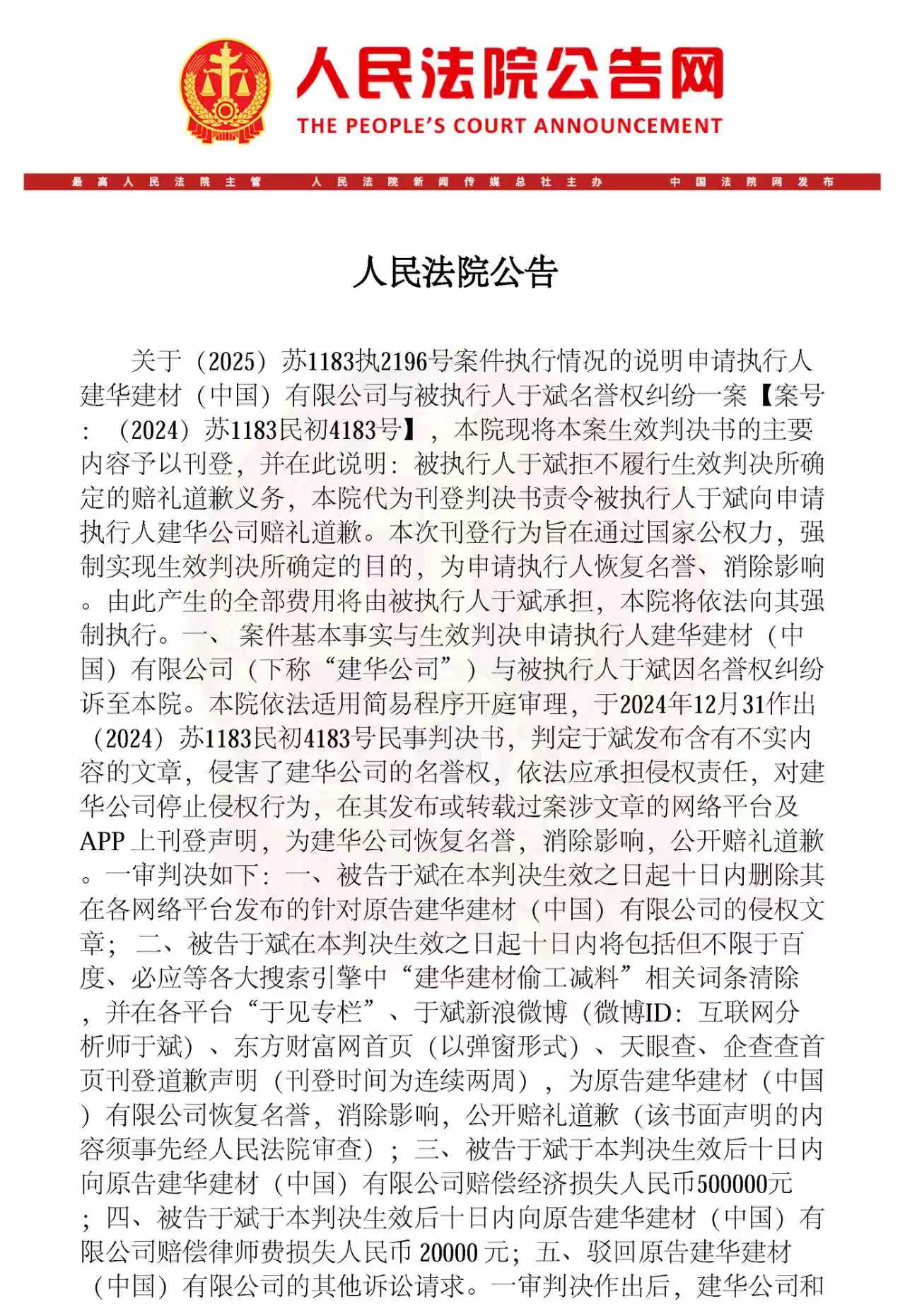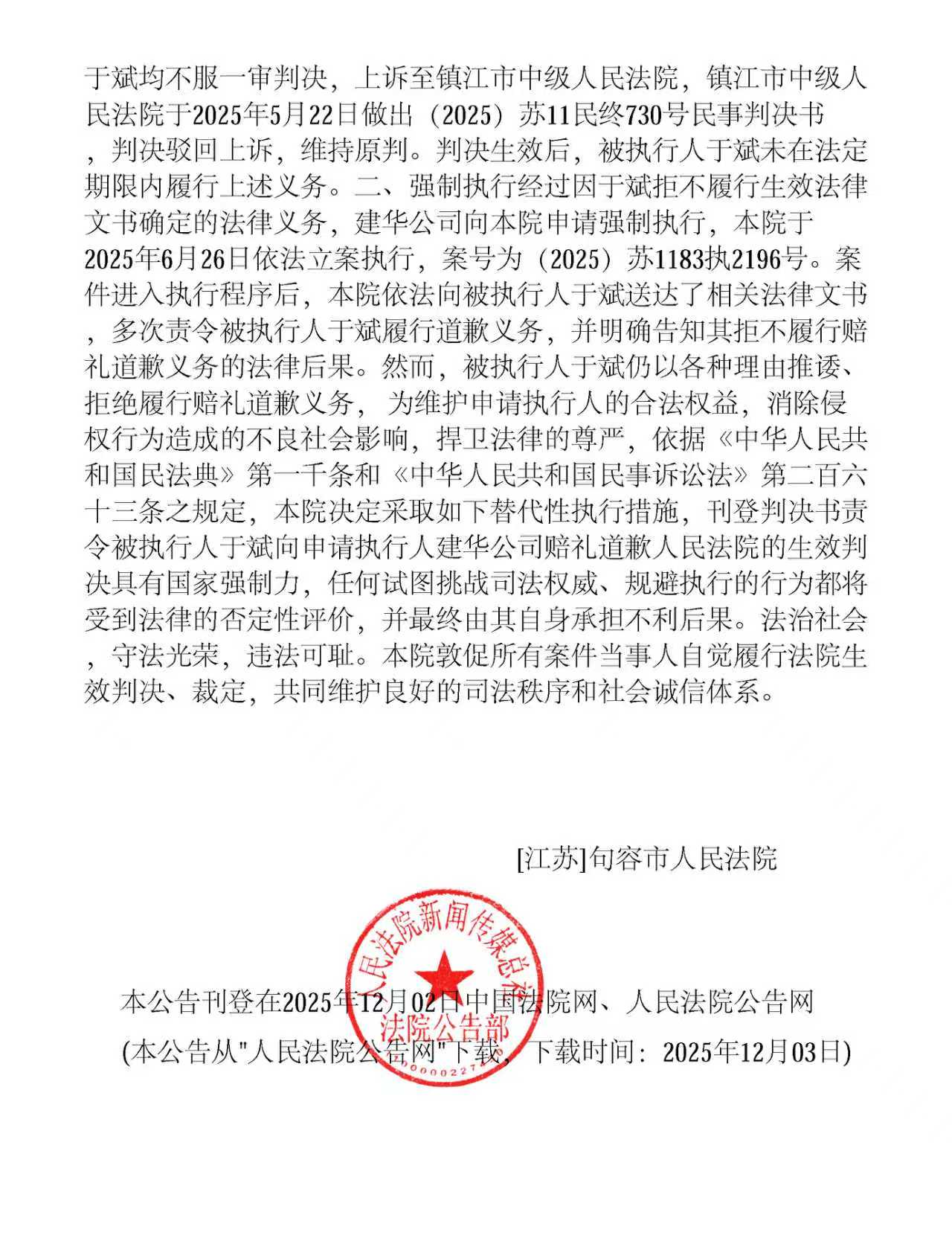 据悉,被执行人于某此前曾在网络平台发布涉及“建华建材偷工减料”等不实文章,经句容市人民法院一审、镇江市中级人民法院二审,均认定其构成名誉侵权。法院判令其删除侵权内容、清除相关不实搜索词条,并连续两周在发布或转载涉案文章的网络平台及APP上刊登道歉声明,同时赔偿经济损失50万元及律师费2万元。然而,判决生效后,于某始终拒绝履行赔礼道歉的义务。