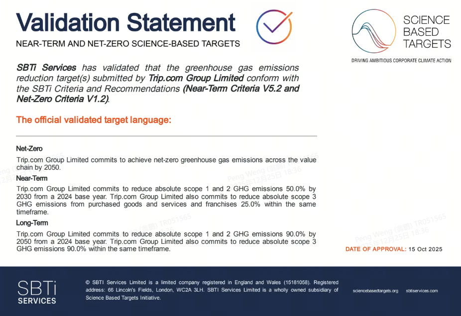 携程集团获SBTi认证