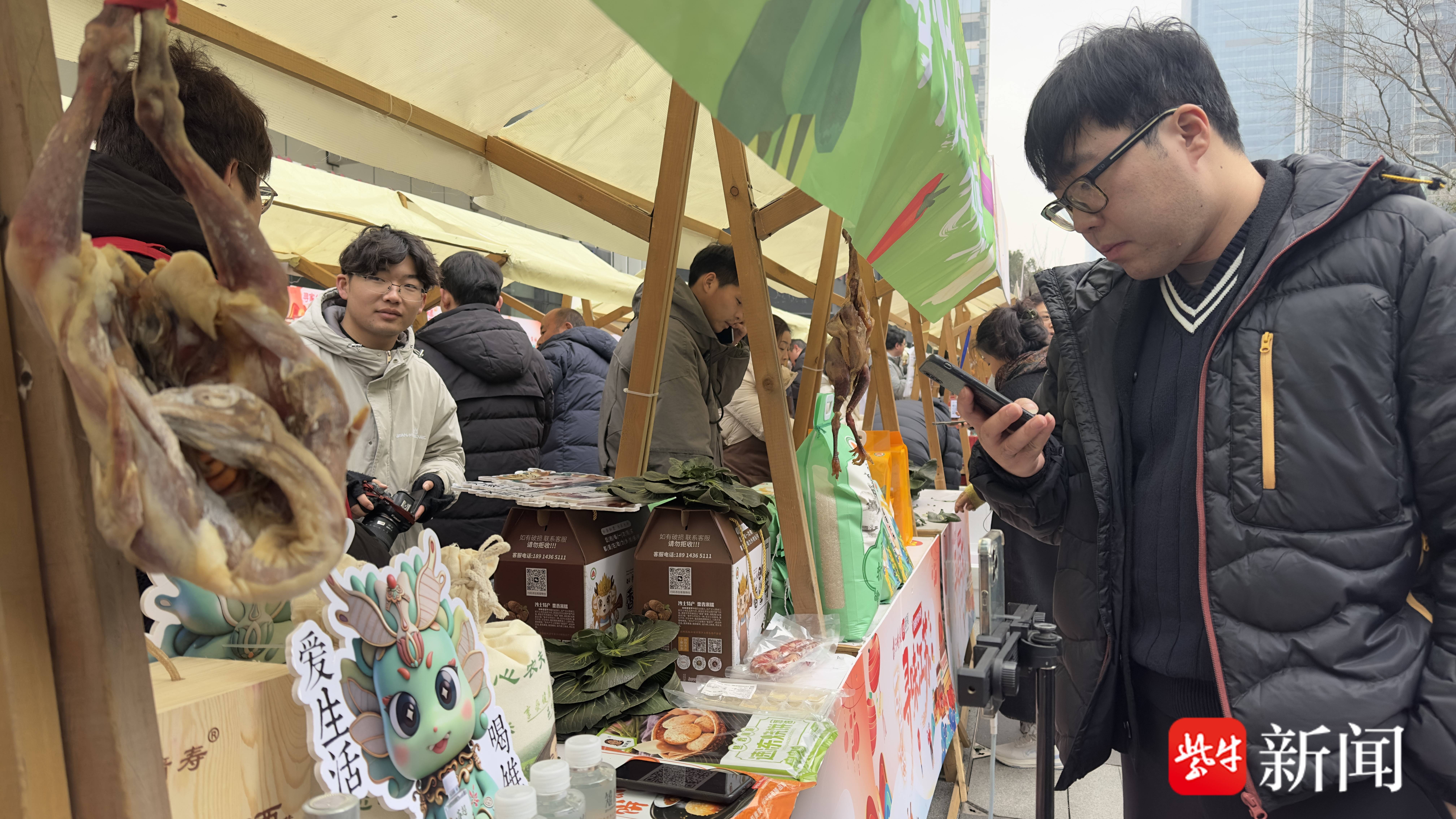在同步举行的“一口乡愁”新春好物市集上,“家乡互联”平台汇聚来自邳州、如皋、盱眙、兴化等地的二十余家原产地商户,将扬州兰亭香包子、江宁桐叶有机草莓、苏州苏垦南粳46大米、南通新中腐乳等江苏地道风味带入线下市集。邳州各乡镇摊位前人气火爆,邳州炒货、宿羊山黑蒜、炮车糖葫芦等特色农产品吸引众多市民驻足品尝;如皋展区则集中呈现黑猪油、片片酥、紫桃干、莲藕粉、黑塌菜等本土好物;万科田园乡村事业部也携兴化大米、清米酒、菜籽油亮相。此外,盱眙天泉湖度假区带来的瓜蒌子、碧根果、葛根粉等特产同样引人注目。热气腾腾、新鲜出炉的市集好物,描绘出一幅市井烟火与家乡情怀交织的温暖画卷。