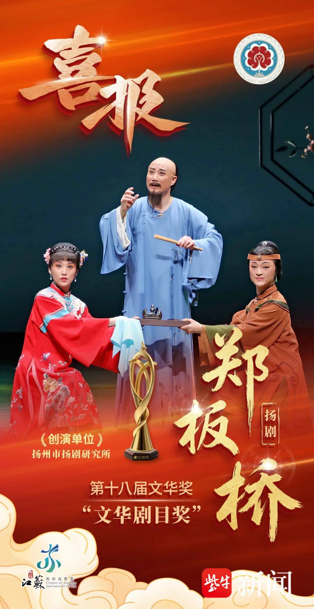 在第十八届国家文华奖评选中,我省扬剧《郑板桥》、舞剧《红楼梦》、淮剧小戏《赶脚》、民族管弦乐《江河湖海颂》、滑稽戏《陈奂生的吃饭问题》等5部作品获奖,数量居全国第一。