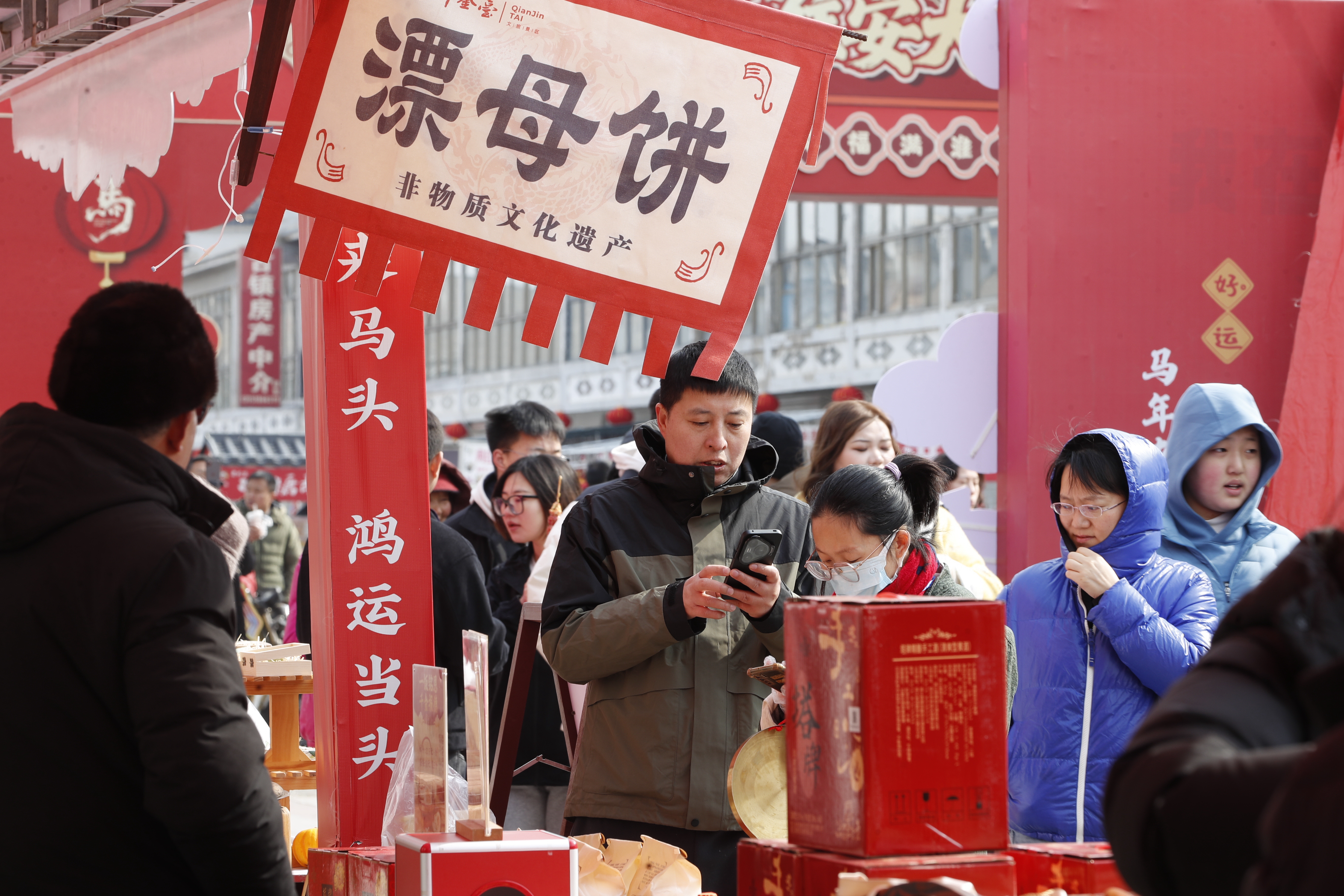 这里汇聚苏皖鲁豫四省特色年货,从本地炸货到山东小吃应有尽有。旁边,国家级非遗“邳州跑竹马”与高跷、舞狮轮番上演,马年主题手工艺品琳琅满目,是一场跨越省界的年味大联欢。